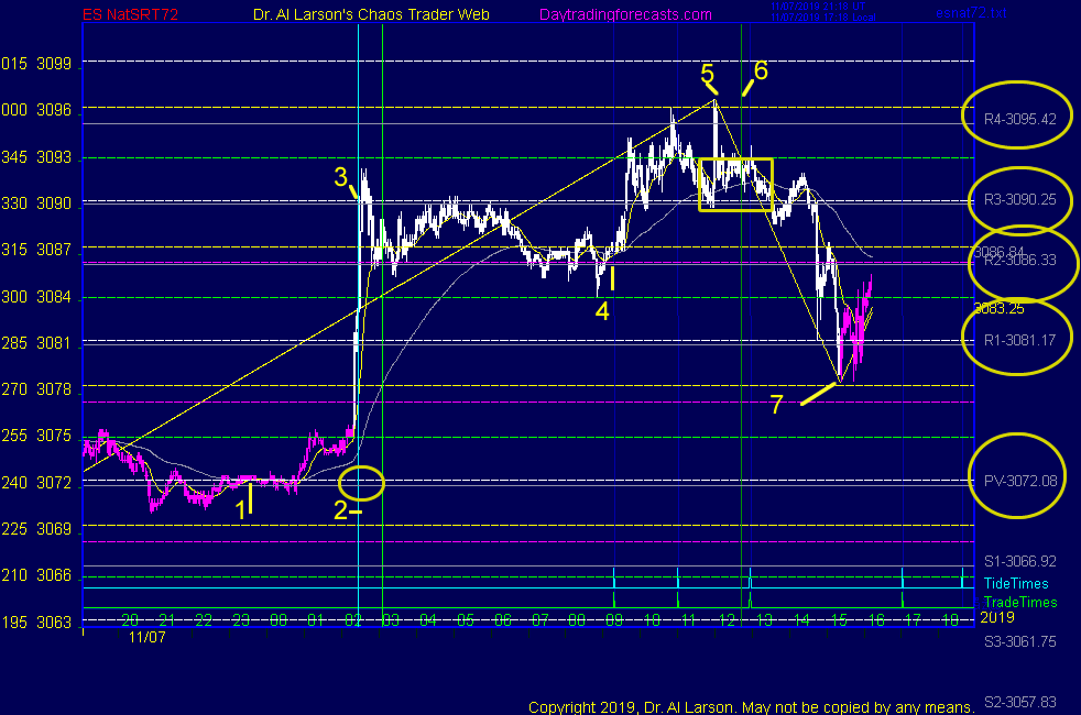 For the first six hours prices traded near the Pivot price, at point 1. This was along a white