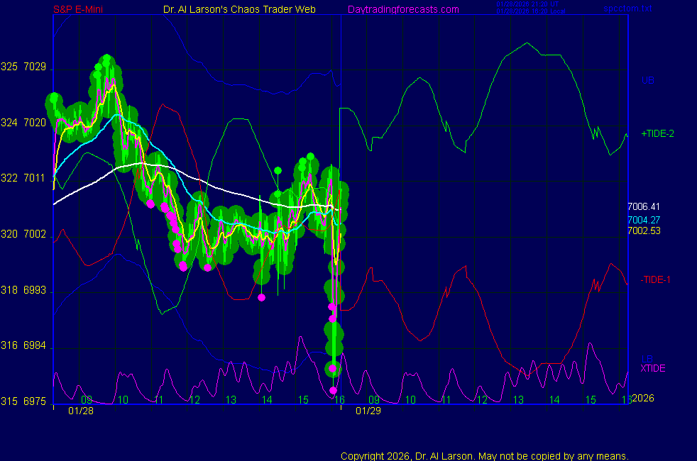 Today: as per chart 3 on SPKISS page 09:31 440, 220, 110 up; buy 6955 carried through 13:23 covered 6990 for +35 Tomorrow: Moon conjoin Uranus **************************************************************************** during these volatile times, the point values in these instructions should multiplied by 5 ***************************************************************************** For trade times before 11:00, be sure to use EXMA's that include data from 8:15 Eastern Normal Rules ( as published on daytrading forecasts.com in the tutorial): These fit a Trend or Trend continuation scenario, identified by prices trading within a couple of points of the 110 minute EXMA, taking profits on a 12 point range. 1. Watch for the opportunity to go with the trend or change in trend at the time(s) given. Be alert for the turn coming early or late. Be patient and use the tracking indicators. Plan to trade in the direction of the 110 EXMA coming out of that time frame. Prices should stay on one side of the 110 EXMA and it should be moving, or curl up or down from a flat position. Prices should be within about 2 points of the 110 EXMA. The 20 minute EXMA should have crossed the 110 EXMA, or moved toward it and then pulled away from it. When this setup is clear, enter in the direction of the 110 EXMA with a 3 point stop. *** in volatile markets this may need to be 6 points If each setup is not clear 60 minutes after the given time, skip the trade. 2. Move the stop 1 point each 30 minutes. If the market moves decently, trail it by 3 points ( 6 points in volatile markets). 3. Cover on a 5 point gain**, 90 minutes after entry , at the next Tide turn , or if the prices clearly recross the 110 minute EXMA. ********************************************************************** **FAST MOVE RULE If the trade gains 3 points within 30 minutes of entry, press the stop, using the 20 EXMA as a guide to move the stop to the low or high of each pullback (normally about 15 minutes long) once the move makes a new high or low. Cover any gain of 9* points. *It is OK to use the fast stop rule if a trade starts fast, but to then cover at +5 or +4 if it slows or stalls *** Stall rule: Cover any trade that stalls for more than 45 minutes *** Carry through rule If you are in a trade that is working well, if is OK to carry through the next Tide turn *** GO BIG rule: if morning is a big move (>12 points ), and midday is a congestion or pullback, and the last trade of the day sets up near 2:00, a move greater than 9 points may be captured using the technique illustrated at http://moneytide.com/hans/cc09092008.asp *** VOLATILE MARKET RULE -use with discretion in volatile markets, the 55 minute EXMA used in place of the 110 minute EXMA may provide an earlier and lower risk entry. This is most useful when the market is extremely oversold or overbought and reversing, or during a fast move with minimal dips and one is looking to join the move. |