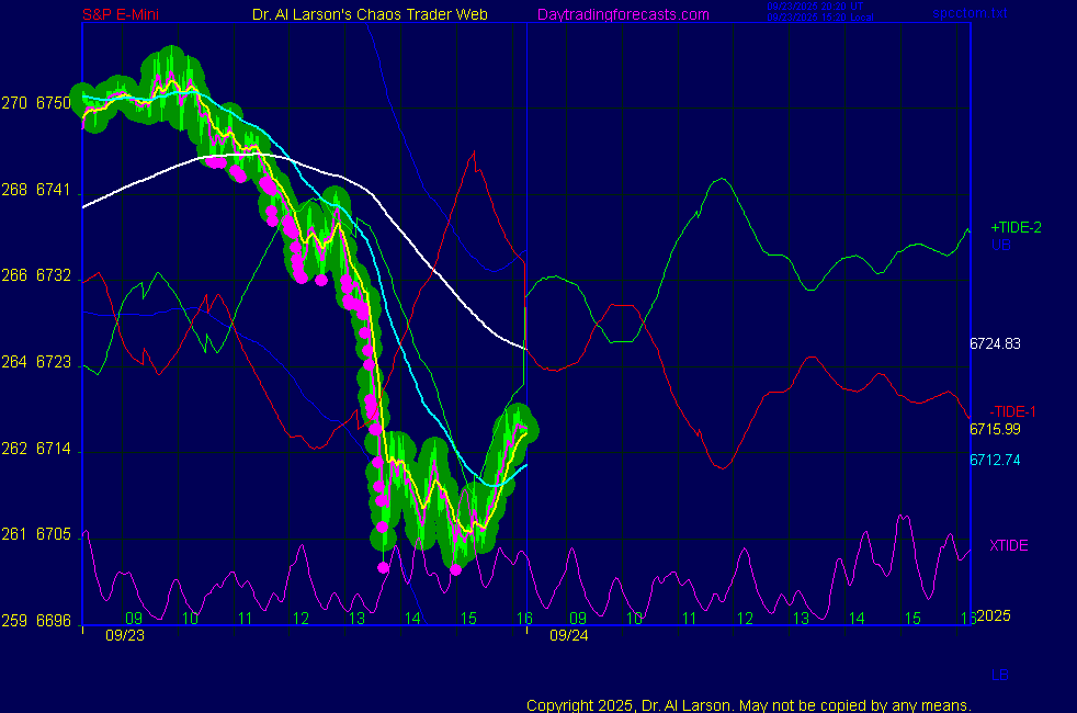 ![]() ![]() Today: as per chart 3 on SPKISS page 10:48 440, 220, 110 up; buy 6722 carried through 12:50 and 14:35 stopped 6750 for +28 Tomorrow: Moon oppose Chiron **************************************************************************** during these volatile times, the point values in these instructions should multiplied by 5 ***************************************************************************** For trade times before 11:00, be sure to use EXMA's that include data from 8:15 Eastern Normal Rules ( as published on daytrading forecasts.com in the tutorial): These fit a Trend or Trend continuation scenario, identified by prices trading within a couple of points of the 110 minute EXMA, taking profits on a 12 point range. 1. Watch for the opportunity to go with the trend or change in trend at the time(s) given. Be alert for the turn coming early or late. Be patient and use the tracking indicators. Plan to trade in the direction of the 110 EXMA coming out of that time frame. Prices should stay on one side of the 110 EXMA and it should be moving, or curl up or down from a flat position. Prices should be within about 2 points of the 110 EXMA. The 20 minute EXMA should have crossed the 110 EXMA, or moved toward it and then pulled away from it. When this setup is clear, enter in the direction of the 110 EXMA with a 3 point stop. *** in volatile markets this may need to be 6 points If each setup is not clear 60 minutes after the given time, skip the trade. 2. Move the stop 1 point each 30 minutes. If the market moves decently, trail it by 3 points ( 6 points in volatile markets). 3. Cover on a 5 point gain**, 90 minutes after entry , at the next Tide turn , or if the prices clearly recross the 110 minute EXMA. ********************************************************************** **FAST MOVE RULE If the trade gains 3 points within 30 minutes of entry, press the stop, using the 20 EXMA as a guide to move the stop to the low or high of each pullback (normally about 15 minutes long) once the move makes a new high or low. Cover any gain of 9* points. *It is OK to use the fast stop rule if a trade starts fast, but to then cover at +5 or +4 if it slows or stalls *** Stall rule: Cover any trade that stalls for more than 45 minutes *** Carry through rule If you are in a trade that is working well, if is OK to carry through the next Tide turn *** GO BIG rule: if morning is a big move (>12 points ), and midday is a congestion or pullback, and the last trade of the day sets up near 2:00, a move greater than 9 points may be captured using the technique illustrated at http://moneytide.com/hans/cc09092008.asp *** VOLATILE MARKET RULE -use with discretion in volatile markets, the 55 minute EXMA used in place of the 110 minute EXMA may provide an earlier and lower risk entry. This is most useful when the market is extremely oversold or overbought and reversing, or during a fast move with minimal dips and one is looking to join the move. |