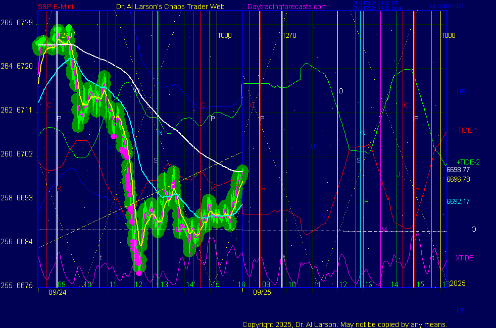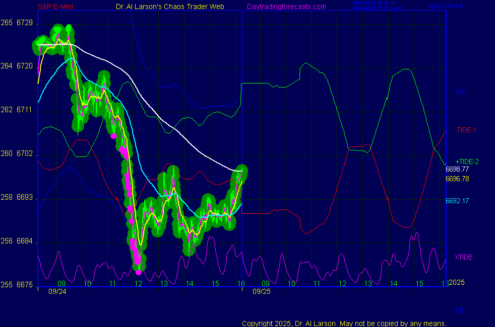 ![]() ![]() Today: as per chart 3 on SPKISS page 10:33 440, 220, 110 down; sold 6649 carried through 12:36 ; covered 6610 for +39 Tomorrow: Moon conjoin Mars, square Pluto **************************************************************************** during these volatile times, the point values in these instructions should multiplied by 5 ***************************************************************************** For trade times before 11:00, be sure to use EXMA's that include data from 8:15 Eastern Normal Rules ( as published on daytrading forecasts.com in the tutorial): These fit a Trend or Trend continuation scenario, identified by prices trading within a couple of points of the 110 minute EXMA, taking profits on a 12 point range. 1. Watch for the opportunity to go with the trend or change in trend at the time(s) given. Be alert for the turn coming early or late. Be patient and use the tracking indicators. Plan to trade in the direction of the 110 EXMA coming out of that time frame. Prices should stay on one side of the 110 EXMA and it should be moving, or curl up or down from a flat position. Prices should be within about 2 points of the 110 EXMA. The 20 minute EXMA should have crossed the 110 EXMA, or moved toward it and then pulled away from it. When this setup is clear, enter in the direction of the 110 EXMA with a 3 point stop. *** in volatile markets this may need to be 6 points If each setup is not clear 60 minutes after the given time, skip the trade. 2. Move the stop 1 point each 30 minutes. If the market moves decently, trail it by 3 points ( 6 points in volatile markets). 3. Cover on a 5 point gain**, 90 minutes after entry , at the next Tide turn , or if the prices clearly recross the 110 minute EXMA. ********************************************************************** **FAST MOVE RULE If the trade gains 3 points within 30 minutes of entry, press the stop, using the 20 EXMA as a guide to move the stop to the low or high of each pullback (normally about 15 minutes long) once the move makes a new high or low. Cover any gain of 9* points. *It is OK to use the fast stop rule if a trade starts fast, but to then cover at +5 or +4 if it slows or stalls *** Stall rule: Cover any trade that stalls for more than 45 minutes *** Carry through rule If you are in a trade that is working well, if is OK to carry through the next Tide turn *** GO BIG rule: if morning is a big move (>12 points ), and midday is a congestion or pullback, and the last trade of the day sets up near 2:00, a move greater than 9 points may be captured using the technique illustrated at http://moneytide.com/hans/cc09092008.asp *** VOLATILE MARKET RULE -use with discretion in volatile markets, the 55 minute EXMA used in place of the 110 minute EXMA may provide an earlier and lower risk entry. This is most useful when the market is extremely oversold or overbought and reversing, or during a fast move with minimal dips and one is looking to join the move. |