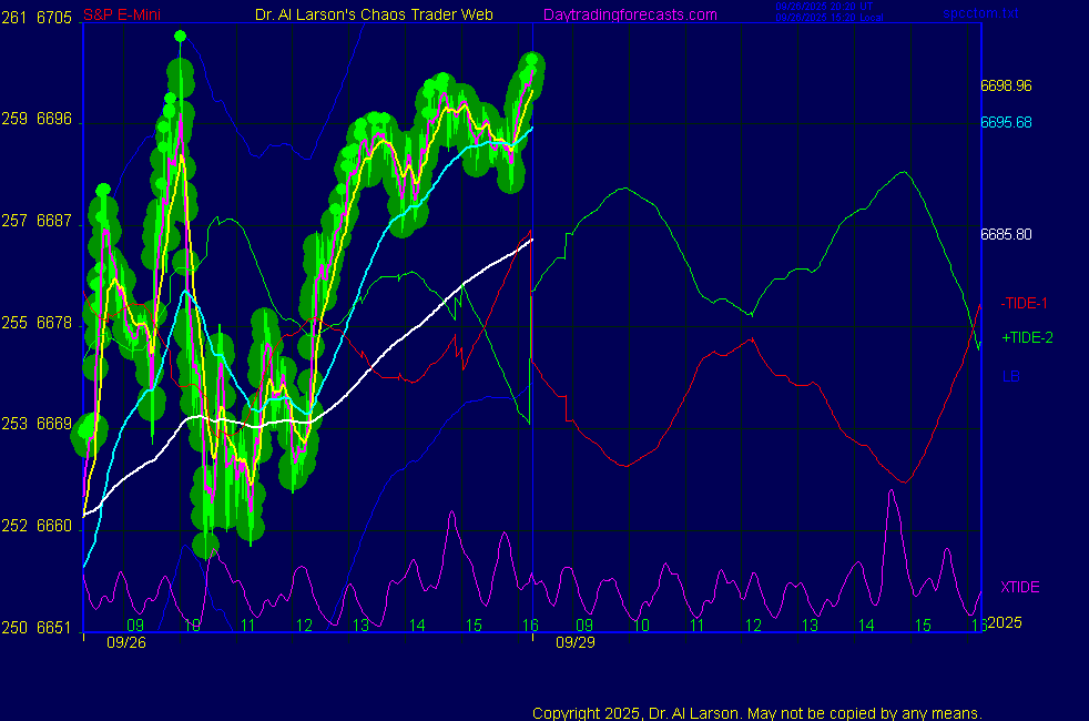![]() ![]() Today: as per chart 3 on SPKISS page 10:51 440, 220, 110 down; sell 6660; stopped for -5 12:32 440, 220, 110 down; sell 6663; stopped 6640 for +23 14:50 440 down, 110 up; passed Tomorrow: Moon oppose Uranus **************************************************************************** during these volatile times, the point values in these instructions should multiplied by 5 ***************************************************************************** For trade times before 11:00, be sure to use EXMA's that include data from 8:15 Eastern Normal Rules ( as published on daytrading forecasts.com in the tutorial): These fit a Trend or Trend continuation scenario, identified by prices trading within a couple of points of the 110 minute EXMA, taking profits on a 12 point range. 1. Watch for the opportunity to go with the trend or change in trend at the time(s) given. Be alert for the turn coming early or late. Be patient and use the tracking indicators. Plan to trade in the direction of the 110 EXMA coming out of that time frame. Prices should stay on one side of the 110 EXMA and it should be moving, or curl up or down from a flat position. Prices should be within about 2 points of the 110 EXMA. The 20 minute EXMA should have crossed the 110 EXMA, or moved toward it and then pulled away from it. When this setup is clear, enter in the direction of the 110 EXMA with a 3 point stop. *** in volatile markets this may need to be 6 points If each setup is not clear 60 minutes after the given time, skip the trade. 2. Move the stop 1 point each 30 minutes. If the market moves decently, trail it by 3 points ( 6 points in volatile markets). 3. Cover on a 5 point gain**, 90 minutes after entry , at the next Tide turn , or if the prices clearly recross the 110 minute EXMA. ********************************************************************** **FAST MOVE RULE If the trade gains 3 points within 30 minutes of entry, press the stop, using the 20 EXMA as a guide to move the stop to the low or high of each pullback (normally about 15 minutes long) once the move makes a new high or low. Cover any gain of 9* points. *It is OK to use the fast stop rule if a trade starts fast, but to then cover at +5 or +4 if it slows or stalls *** Stall rule: Cover any trade that stalls for more than 45 minutes *** Carry through rule If you are in a trade that is working well, if is OK to carry through the next Tide turn *** GO BIG rule: if morning is a big move (>12 points ), and midday is a congestion or pullback, and the last trade of the day sets up near 2:00, a move greater than 9 points may be captured using the technique illustrated at http://moneytide.com/hans/cc09092008.asp *** VOLATILE MARKET RULE -use with discretion in volatile markets, the 55 minute EXMA used in place of the 110 minute EXMA may provide an earlier and lower risk entry. This is most useful when the market is extremely oversold or overbought and reversing, or during a fast move with minimal dips and one is looking to join the move. |