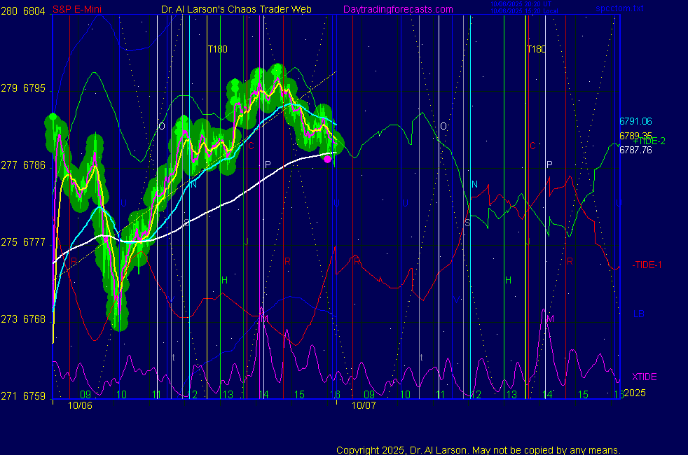 ![]() ![]() Today: per chart 3 on the SPKISS page 10:49 440, 220, 110 up; bought 6781 stopped for +13 12:18 440, 220, 110 down; sold 6787, stopped 6769 for +18 14:29 passed Tomorrow: Moon oppose Sun **************************************************************************** during these volatile times, the point values in these instructions should multiplied by 5 ***************************************************************************** For trade times before 11:00, be sure to use EXMA's that include data from 8:15 Eastern Normal Rules ( as published on daytrading forecasts.com in the tutorial): These fit a Trend or Trend continuation scenario, identified by prices trading within a couple of points of the 110 minute EXMA, taking profits on a 12 point range. 1. Watch for the opportunity to go with the trend or change in trend at the time(s) given. Be alert for the turn coming early or late. Be patient and use the tracking indicators. Plan to trade in the direction of the 110 EXMA coming out of that time frame. Prices should stay on one side of the 110 EXMA and it should be moving, or curl up or down from a flat position. Prices should be within about 2 points of the 110 EXMA. The 20 minute EXMA should have crossed the 110 EXMA, or moved toward it and then pulled away from it. When this setup is clear, enter in the direction of the 110 EXMA with a 3 point stop. *** in volatile markets this may need to be 6 points If each setup is not clear 60 minutes after the given time, skip the trade. 2. Move the stop 1 point each 30 minutes. If the market moves decently, trail it by 3 points ( 6 points in volatile markets). 3. Cover on a 5 point gain**, 90 minutes after entry , at the next Tide turn , or if the prices clearly recross the 110 minute EXMA. ********************************************************************** **FAST MOVE RULE If the trade gains 3 points within 30 minutes of entry, press the stop, using the 20 EXMA as a guide to move the stop to the low or high of each pullback (normally about 15 minutes long) once the move makes a new high or low. Cover any gain of 9* points. *It is OK to use the fast stop rule if a trade starts fast, but to then cover at +5 or +4 if it slows or stalls *** Stall rule: Cover any trade that stalls for more than 45 minutes *** Carry through rule If you are in a trade that is working well, if is OK to carry through the next Tide turn *** GO BIG rule: if morning is a big move (>12 points ), and midday is a congestion or pullback, and the last trade of the day sets up near 2:00, a move greater than 9 points may be captured using the technique illustrated at http://moneytide.com/hans/cc09092008.asp *** VOLATILE MARKET RULE -use with discretion in volatile markets, the 55 minute EXMA used in place of the 110 minute EXMA may provide an earlier and lower risk entry. This is most useful when the market is extremely oversold or overbought and reversing, or during a fast move with minimal dips and one is looking to join the move. |