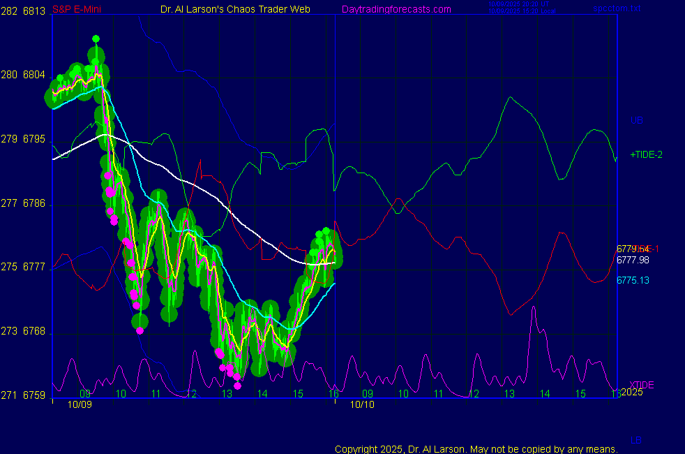 ![]() ![]() Today: per chart 3 on the SPKISS page 09:31 440, 220, 110 up; buy 6771 carried through 12:24 stopped 6796 for +25 Tomorrow: Moon applying conjunction Uranus **************************************************************************** during these volatile times, the point values in these instructions should multiplied by 5 ***************************************************************************** For trade times before 11:00, be sure to use EXMA's that include data from 8:15 Eastern Normal Rules ( as published on daytrading forecasts.com in the tutorial): These fit a Trend or Trend continuation scenario, identified by prices trading within a couple of points of the 110 minute EXMA, taking profits on a 12 point range. 1. Watch for the opportunity to go with the trend or change in trend at the time(s) given. Be alert for the turn coming early or late. Be patient and use the tracking indicators. Plan to trade in the direction of the 110 EXMA coming out of that time frame. Prices should stay on one side of the 110 EXMA and it should be moving, or curl up or down from a flat position. Prices should be within about 2 points of the 110 EXMA. The 20 minute EXMA should have crossed the 110 EXMA, or moved toward it and then pulled away from it. When this setup is clear, enter in the direction of the 110 EXMA with a 3 point stop. *** in volatile markets this may need to be 6 points If each setup is not clear 60 minutes after the given time, skip the trade. 2. Move the stop 1 point each 30 minutes. If the market moves decently, trail it by 3 points ( 6 points in volatile markets). 3. Cover on a 5 point gain**, 90 minutes after entry , at the next Tide turn , or if the prices clearly recross the 110 minute EXMA. ********************************************************************** **FAST MOVE RULE If the trade gains 3 points within 30 minutes of entry, press the stop, using the 20 EXMA as a guide to move the stop to the low or high of each pullback (normally about 15 minutes long) once the move makes a new high or low. Cover any gain of 9* points. *It is OK to use the fast stop rule if a trade starts fast, but to then cover at +5 or +4 if it slows or stalls *** Stall rule: Cover any trade that stalls for more than 45 minutes *** Carry through rule If you are in a trade that is working well, if is OK to carry through the next Tide turn *** GO BIG rule: if morning is a big move (>12 points ), and midday is a congestion or pullback, and the last trade of the day sets up near 2:00, a move greater than 9 points may be captured using the technique illustrated at http://moneytide.com/hans/cc09092008.asp *** VOLATILE MARKET RULE -use with discretion in volatile markets, the 55 minute EXMA used in place of the 110 minute EXMA may provide an earlier and lower risk entry. This is most useful when the market is extremely oversold or overbought and reversing, or during a fast move with minimal dips and one is looking to join the move. |