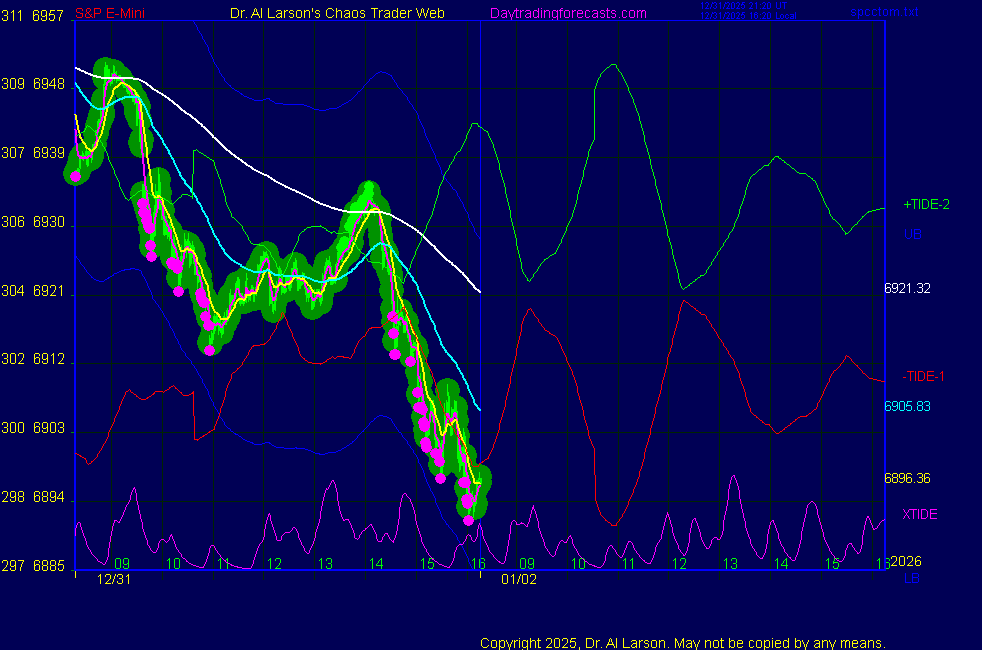 Today: as per chart 3 on the SPKISS page 09:38 440, 220, 110 down after spoke high; sold 6950; stopped 6948 for +2 13:37 440, 220, 110 flat-passed Tomorrow: Moon conjoin Uranus, octile Jupiter **************************************************************************** during these volatile times, the point values in these instructions should multiplied by 5 ***************************************************************************** For trade times before 11:00, be sure to use EXMA's that include data from 8:15 Eastern Normal Rules ( as published on daytrading forecasts.com in the tutorial): These fit a Trend or Trend continuation scenario, identified by prices trading within a couple of points of the 110 minute EXMA, taking profits on a 12 point range. 1. Watch for the opportunity to go with the trend or change in trend at the time(s) given. Be alert for the turn coming early or late. Be patient and use the tracking indicators. Plan to trade in the direction of the 110 EXMA coming out of that time frame. Prices should stay on one side of the 110 EXMA and it should be moving, or curl up or down from a flat position. Prices should be within about 2 points of the 110 EXMA. The 20 minute EXMA should have crossed the 110 EXMA, or moved toward it and then pulled away from it. When this setup is clear, enter in the direction of the 110 EXMA with a 3 point stop. *** in volatile markets this may need to be 6 points If each setup is not clear 60 minutes after the given time, skip the trade. 2. Move the stop 1 point each 30 minutes. If the market moves decently, trail it by 3 points ( 6 points in volatile markets). 3. Cover on a 5 point gain**, 90 minutes after entry , at the next Tide turn , or if the prices clearly recross the 110 minute EXMA. ********************************************************************** **FAST MOVE RULE If the trade gains 3 points within 30 minutes of entry, press the stop, using the 20 EXMA as a guide to move the stop to the low or high of each pullback (normally about 15 minutes long) once the move makes a new high or low. Cover any gain of 9* points. *It is OK to use the fast stop rule if a trade starts fast, but to then cover at +5 or +4 if it slows or stalls *** Stall rule: Cover any trade that stalls for more than 45 minutes *** Carry through rule If you are in a trade that is working well, if is OK to carry through the next Tide turn *** GO BIG rule: if morning is a big move (>12 points ), and midday is a congestion or pullback, and the last trade of the day sets up near 2:00, a move greater than 9 points may be captured using the technique illustrated at http://moneytide.com/hans/cc09092008.asp *** VOLATILE MARKET RULE -use with discretion in volatile markets, the 55 minute EXMA used in place of the 110 minute EXMA may provide an earlier and lower risk entry. This is most useful when the market is extremely oversold or overbought and reversing, or during a fast move with minimal dips and one is looking to join the move. |