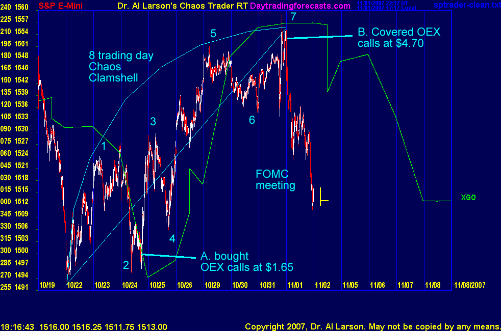 I was pleasantly surprised that the switch came within an hour of my option buy. Then all I had to do was wait. On the 31st - fittingly Halloween - the Fed did cut rates, by a quarter point. The market reacted with a drop, and a rally. On the rally, I covered my calls. The XGO forecast showed no higher prices, and the news was out. I did not want to hold any longer, because the premium decay was working against me. I also recognized a nice 8 day up Chaos Clamshell. No need to wait. Cash In On Chaos! As it turned out, it was a great exit, since today was hard down. I don't always make trades this good. But this one was very good, and worth sharing for the educational value. Now that I am semi-retired, I did not try to tell others about my trade strategy, but I did post the XGO swing chart in the Certified Chaos Traders room last week, and on the 24th I posted it on the AUX page, and pointed it out in the chat room. Astute, serious traders could have done what I did. If you missed the opportunity, no problem. There are more coming. Be prepared. As always, knowledge gives you an edge in trading. P. S. Individual XGO charts can be ordered at Moneytide.com |