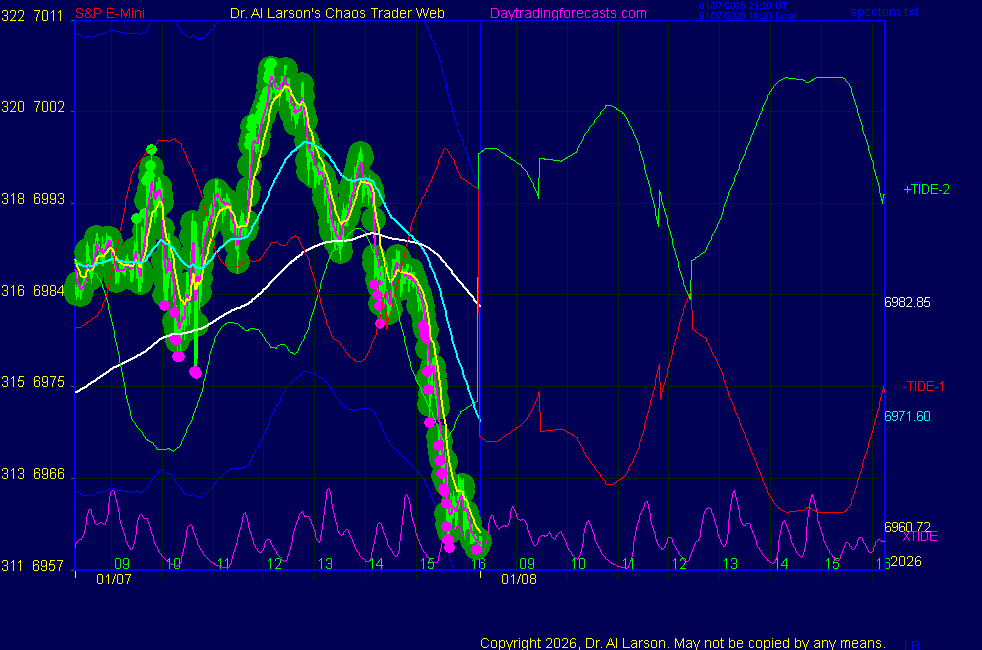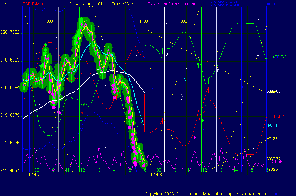 Today: as per chart 3 on the SPKISS page 09:42 440, 220, 110 up; buy 6955, stopped 6969 for +14 11:02 440 up, 220 and 110 dipped, then up; buy 6966 covered 6886 for +20 Tomorrow: Moon oppose Node two Moon day; often volatile; usually goes Moon to Moon, of Moon, Sun, Moon **************************************************************************** during these volatile times, the point values in these instructions should multiplied by 5 ***************************************************************************** For trade times before 11:00, be sure to use EXMA's that include data from 8:15 Eastern Normal Rules ( as published on daytrading forecasts.com in the tutorial): These fit a Trend or Trend continuation scenario, identified by prices trading within a couple of points of the 110 minute EXMA, taking profits on a 12 point range. 1. Watch for the opportunity to go with the trend or change in trend at the time(s) given. Be alert for the turn coming early or late. Be patient and use the tracking indicators. Plan to trade in the direction of the 110 EXMA coming out of that time frame. Prices should stay on one side of the 110 EXMA and it should be moving, or curl up or down from a flat position. Prices should be within about 2 points of the 110 EXMA. The 20 minute EXMA should have crossed the 110 EXMA, or moved toward it and then pulled away from it. When this setup is clear, enter in the direction of the 110 EXMA with a 3 point stop. *** in volatile markets this may need to be 6 points If each setup is not clear 60 minutes after the given time, skip the trade. 2. Move the stop 1 point each 30 minutes. If the market moves decently, trail it by 3 points ( 6 points in volatile markets). 3. Cover on a 5 point gain**, 90 minutes after entry , at the next Tide turn , or if the prices clearly recross the 110 minute EXMA. ********************************************************************** **FAST MOVE RULE If the trade gains 3 points within 30 minutes of entry, press the stop, using the 20 EXMA as a guide to move the stop to the low or high of each pullback (normally about 15 minutes long) once the move makes a new high or low. Cover any gain of 9* points. *It is OK to use the fast stop rule if a trade starts fast, but to then cover at +5 or +4 if it slows or stalls *** Stall rule: Cover any trade that stalls for more than 45 minutes *** Carry through rule If you are in a trade that is working well, if is OK to carry through the next Tide turn *** GO BIG rule: if morning is a big move (>12 points ), and midday is a congestion or pullback, and the last trade of the day sets up near 2:00, a move greater than 9 points may be captured using the technique illustrated at http://moneytide.com/hans/cc09092008.asp *** VOLATILE MARKET RULE -use with discretion in volatile markets, the 55 minute EXMA used in place of the 110 minute EXMA may provide an earlier and lower risk entry. This is most useful when the market is extremely oversold or overbought and reversing, or during a fast move with minimal dips and one is looking to join the move. |
