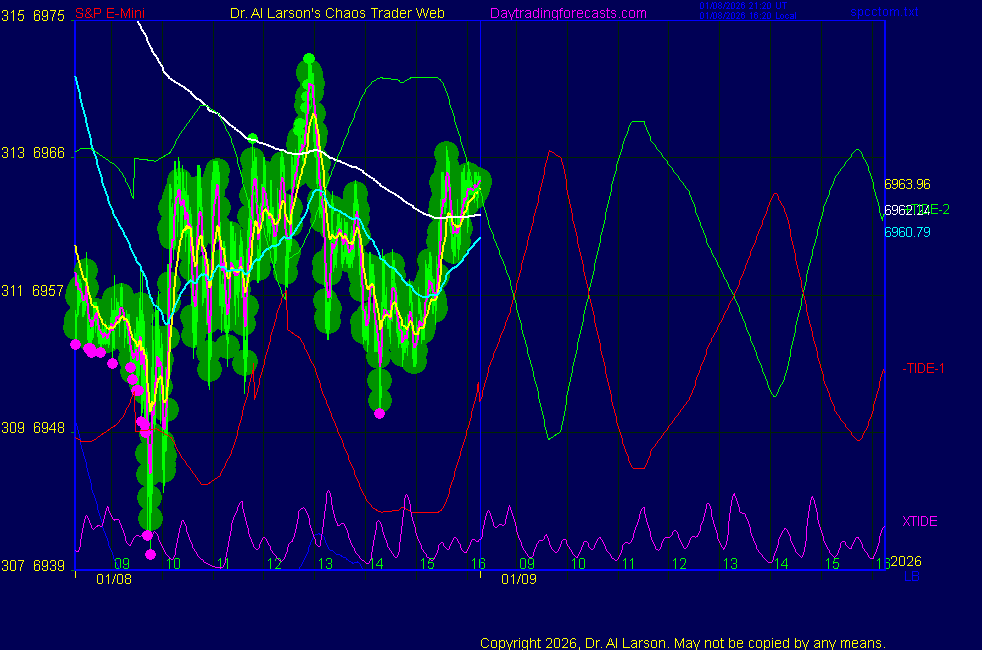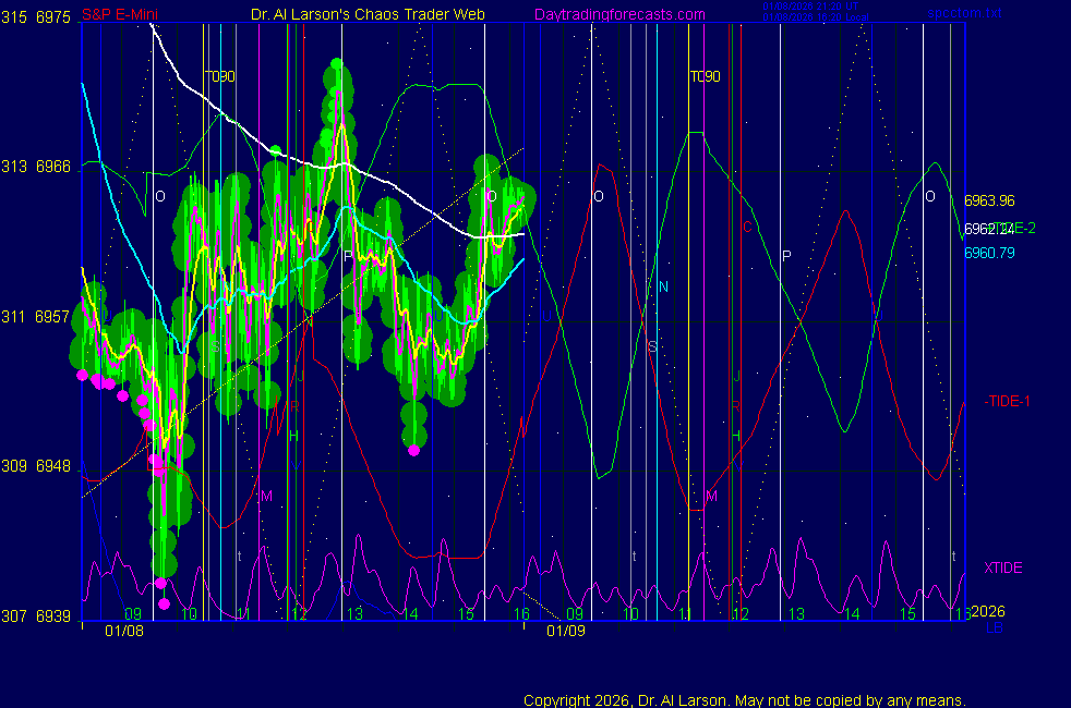 Today: as per chart 3 on the SPKISS page 10:16 440, 220, 110 up; bought 6994 stopped 7002 for +8 13:51 440, 220, 110 down; sold 6987 covered 6964 for +23 Tomorrow: Moon oppose Saturn, trine Uranus **************************************************************************** during these volatile times, the point values in these instructions should multiplied by 5 ***************************************************************************** For trade times before 11:00, be sure to use EXMA's that include data from 8:15 Eastern Normal Rules ( as published on daytrading forecasts.com in the tutorial): These fit a Trend or Trend continuation scenario, identified by prices trading within a couple of points of the 110 minute EXMA, taking profits on a 12 point range. 1. Watch for the opportunity to go with the trend or change in trend at the time(s) given. Be alert for the turn coming early or late. Be patient and use the tracking indicators. Plan to trade in the direction of the 110 EXMA coming out of that time frame. Prices should stay on one side of the 110 EXMA and it should be moving, or curl up or down from a flat position. Prices should be within about 2 points of the 110 EXMA. The 20 minute EXMA should have crossed the 110 EXMA, or moved toward it and then pulled away from it. When this setup is clear, enter in the direction of the 110 EXMA with a 3 point stop. *** in volatile markets this may need to be 6 points If each setup is not clear 60 minutes after the given time, skip the trade. 2. Move the stop 1 point each 30 minutes. If the market moves decently, trail it by 3 points ( 6 points in volatile markets). 3. Cover on a 5 point gain**, 90 minutes after entry , at the next Tide turn , or if the prices clearly recross the 110 minute EXMA. ********************************************************************** **FAST MOVE RULE If the trade gains 3 points within 30 minutes of entry, press the stop, using the 20 EXMA as a guide to move the stop to the low or high of each pullback (normally about 15 minutes long) once the move makes a new high or low. Cover any gain of 9* points. *It is OK to use the fast stop rule if a trade starts fast, but to then cover at +5 or +4 if it slows or stalls *** Stall rule: Cover any trade that stalls for more than 45 minutes *** Carry through rule If you are in a trade that is working well, if is OK to carry through the next Tide turn *** GO BIG rule: if morning is a big move (>12 points ), and midday is a congestion or pullback, and the last trade of the day sets up near 2:00, a move greater than 9 points may be captured using the technique illustrated at http://moneytide.com/hans/cc09092008.asp *** VOLATILE MARKET RULE -use with discretion in volatile markets, the 55 minute EXMA used in place of the 110 minute EXMA may provide an earlier and lower risk entry. This is most useful when the market is extremely oversold or overbought and reversing, or during a fast move with minimal dips and one is looking to join the move. |