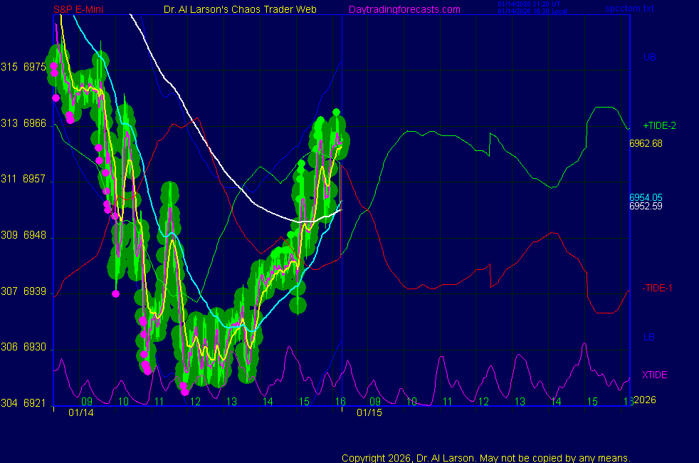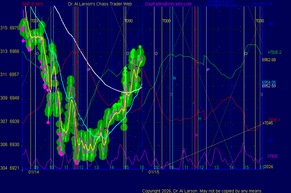 Today: as per chart 3 0n SPKISS page 09:49 440, 220, 110 down; sell 7012 stopped for +10 13:29 440, 220, 110 down; sell 6996 stopped for +9 Tomorrow: Moon square Node **************************************************************************** during these volatile times, the point values in these instructions should multiplied by 5 ***************************************************************************** For trade times before 11:00, be sure to use EXMA's that include data from 8:15 Eastern Normal Rules ( as published on daytrading forecasts.com in the tutorial): These fit a Trend or Trend continuation scenario, identified by prices trading within a couple of points of the 110 minute EXMA, taking profits on a 12 point range. 1. Watch for the opportunity to go with the trend or change in trend at the time(s) given. Be alert for the turn coming early or late. Be patient and use the tracking indicators. Plan to trade in the direction of the 110 EXMA coming out of that time frame. Prices should stay on one side of the 110 EXMA and it should be moving, or curl up or down from a flat position. Prices should be within about 2 points of the 110 EXMA. The 20 minute EXMA should have crossed the 110 EXMA, or moved toward it and then pulled away from it. When this setup is clear, enter in the direction of the 110 EXMA with a 3 point stop. *** in volatile markets this may need to be 6 points If each setup is not clear 60 minutes after the given time, skip the trade. 2. Move the stop 1 point each 30 minutes. If the market moves decently, trail it by 3 points ( 6 points in volatile markets). 3. Cover on a 5 point gain**, 90 minutes after entry , at the next Tide turn , or if the prices clearly recross the 110 minute EXMA. ********************************************************************** **FAST MOVE RULE If the trade gains 3 points within 30 minutes of entry, press the stop, using the 20 EXMA as a guide to move the stop to the low or high of each pullback (normally about 15 minutes long) once the move makes a new high or low. Cover any gain of 9* points. *It is OK to use the fast stop rule if a trade starts fast, but to then cover at +5 or +4 if it slows or stalls *** Stall rule: Cover any trade that stalls for more than 45 minutes *** Carry through rule If you are in a trade that is working well, if is OK to carry through the next Tide turn *** GO BIG rule: if morning is a big move (>12 points ), and midday is a congestion or pullback, and the last trade of the day sets up near 2:00, a move greater than 9 points may be captured using the technique illustrated at http://moneytide.com/hans/cc09092008.asp *** VOLATILE MARKET RULE -use with discretion in volatile markets, the 55 minute EXMA used in place of the 110 minute EXMA may provide an earlier and lower risk entry. This is most useful when the market is extremely oversold or overbought and reversing, or during a fast move with minimal dips and one is looking to join the move. |