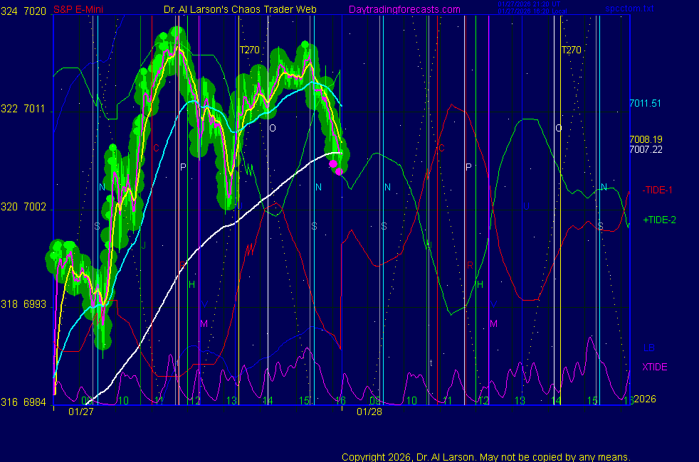 Today: as per chart 3 on SPKISS page 09:31 440, 220, 110 up; buy 6955 carried through 13:23 covered 6990 for +35 Tomorrow: Moon conjoin Uranus **************************************************************************** during these volatile times, the point values in these instructions should multiplied by 5 ***************************************************************************** For trade times before 11:00, be sure to use EXMA's that include data from 8:15 Eastern Normal Rules ( as published on daytrading forecasts.com in the tutorial): These fit a Trend or Trend continuation scenario, identified by prices trading within a couple of points of the 110 minute EXMA, taking profits on a 12 point range. 1. Watch for the opportunity to go with the trend or change in trend at the time(s) given. Be alert for the turn coming early or late. Be patient and use the tracking indicators. Plan to trade in the direction of the 110 EXMA coming out of that time frame. Prices should stay on one side of the 110 EXMA and it should be moving, or curl up or down from a flat position. Prices should be within about 2 points of the 110 EXMA. The 20 minute EXMA should have crossed the 110 EXMA, or moved toward it and then pulled away from it. When this setup is clear, enter in the direction of the 110 EXMA with a 3 point stop. *** in volatile markets this may need to be 6 points If each setup is not clear 60 minutes after the given time, skip the trade. 2. Move the stop 1 point each 30 minutes. If the market moves decently, trail it by 3 points ( 6 points in volatile markets). 3. Cover on a 5 point gain**, 90 minutes after entry , at the next Tide turn , or if the prices clearly recross the 110 minute EXMA. ********************************************************************** **FAST MOVE RULE If the trade gains 3 points within 30 minutes of entry, press the stop, using the 20 EXMA as a guide to move the stop to the low or high of each pullback (normally about 15 minutes long) once the move makes a new high or low. Cover any gain of 9* points. *It is OK to use the fast stop rule if a trade starts fast, but to then cover at +5 or +4 if it slows or stalls *** Stall rule: Cover any trade that stalls for more than 45 minutes *** Carry through rule If you are in a trade that is working well, if is OK to carry through the next Tide turn *** GO BIG rule: if morning is a big move (>12 points ), and midday is a congestion or pullback, and the last trade of the day sets up near 2:00, a move greater than 9 points may be captured using the technique illustrated at http://moneytide.com/hans/cc09092008.asp *** VOLATILE MARKET RULE -use with discretion in volatile markets, the 55 minute EXMA used in place of the 110 minute EXMA may provide an earlier and lower risk entry. This is most useful when the market is extremely oversold or overbought and reversing, or during a fast move with minimal dips and one is looking to join the move. |