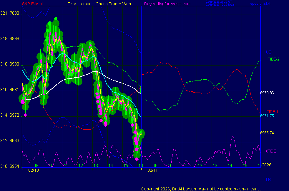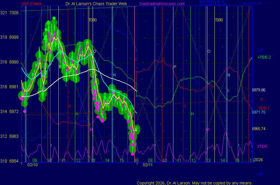 Today: as per chart 3 of SPKISS page 10:49 440, 220, 110 up; buy 6946 carried through 12:20 and 14:00 stopped 6992 for +46 Tomorrow: Moon oppose Uranus, square Mercury **************************************************************************** during these volatile times, the point values in these instructions should multiplied by 5 ***************************************************************************** For trade times before 11:00, be sure to use EXMA's that include data from 8:15 Eastern Normal Rules ( as published on daytrading forecasts.com in the tutorial): These fit a Trend or Trend continuation scenario, identified by prices trading within a couple of points of the 110 minute EXMA, taking profits on a 12 point range. 1. Watch for the opportunity to go with the trend or change in trend at the time(s) given. Be alert for the turn coming early or late. Be patient and use the tracking indicators. Plan to trade in the direction of the 110 EXMA coming out of that time frame. Prices should stay on one side of the 110 EXMA and it should be moving, or curl up or down from a flat position. Prices should be within about 2 points of the 110 EXMA. The 20 minute EXMA should have crossed the 110 EXMA, or moved toward it and then pulled away from it. When this setup is clear, enter in the direction of the 110 EXMA with a 3 point stop. *** in volatile markets this may need to be 6 points If each setup is not clear 60 minutes after the given time, skip the trade. 2. Move the stop 1 point each 30 minutes. If the market moves decently, trail it by 3 points ( 6 points in volatile markets). 3. Cover on a 5 point gain**, 90 minutes after entry , at the next Tide turn , or if the prices clearly recross the 110 minute EXMA. ********************************************************************** **FAST MOVE RULE If the trade gains 3 points within 30 minutes of entry, press the stop, using the 20 EXMA as a guide to move the stop to the low or high of each pullback (normally about 15 minutes long) once the move makes a new high or low. Cover any gain of 9* points. *It is OK to use the fast stop rule if a trade starts fast, but to then cover at +5 or +4 if it slows or stalls *** Stall rule: Cover any trade that stalls for more than 45 minutes *** Carry through rule If you are in a trade that is working well, if is OK to carry through the next Tide turn *** GO BIG rule: if morning is a big move (>12 points ), and midday is a congestion or pullback, and the last trade of the day sets up near 2:00, a move greater than 9 points may be captured using the technique illustrated at http://moneytide.com/hans/cc09092008.asp *** VOLATILE MARKET RULE -use with discretion in volatile markets, the 55 minute EXMA used in place of the 110 minute EXMA may provide an earlier and lower risk entry. This is most useful when the market is extremely oversold or overbought and reversing, or during a fast move with minimal dips and one is looking to join the move. |