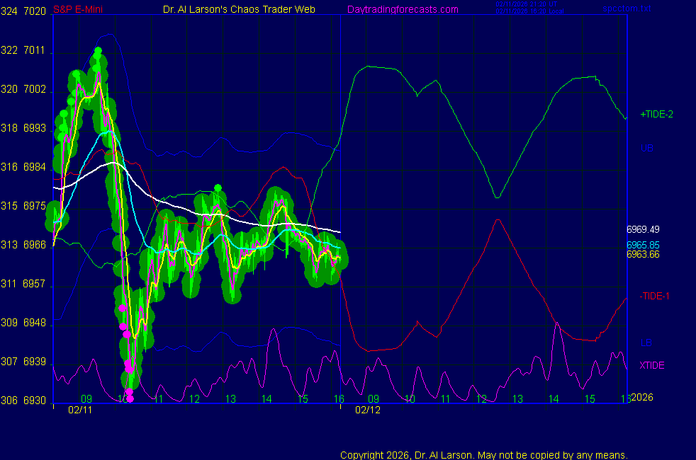 Today: as per chart 3 of SPKISS page 09:31 440, 220, 110 up; buy 6993; stopped for -3 12:54 440,220,110 down; sell 6985; covered 6960 for +25 Tomorrow: Moon pentile Venus (1st) and Jupiter (3rd) **************************************************************************** during these volatile times, the point values in these instructions should multiplied by 5 ***************************************************************************** For trade times before 11:00, be sure to use EXMA's that include data from 8:15 Eastern Normal Rules ( as published on daytrading forecasts.com in the tutorial): These fit a Trend or Trend continuation scenario, identified by prices trading within a couple of points of the 110 minute EXMA, taking profits on a 12 point range. 1. Watch for the opportunity to go with the trend or change in trend at the time(s) given. Be alert for the turn coming early or late. Be patient and use the tracking indicators. Plan to trade in the direction of the 110 EXMA coming out of that time frame. Prices should stay on one side of the 110 EXMA and it should be moving, or curl up or down from a flat position. Prices should be within about 2 points of the 110 EXMA. The 20 minute EXMA should have crossed the 110 EXMA, or moved toward it and then pulled away from it. When this setup is clear, enter in the direction of the 110 EXMA with a 3 point stop. *** in volatile markets this may need to be 6 points If each setup is not clear 60 minutes after the given time, skip the trade. 2. Move the stop 1 point each 30 minutes. If the market moves decently, trail it by 3 points ( 6 points in volatile markets). 3. Cover on a 5 point gain**, 90 minutes after entry , at the next Tide turn , or if the prices clearly recross the 110 minute EXMA. ********************************************************************** **FAST MOVE RULE If the trade gains 3 points within 30 minutes of entry, press the stop, using the 20 EXMA as a guide to move the stop to the low or high of each pullback (normally about 15 minutes long) once the move makes a new high or low. Cover any gain of 9* points. *It is OK to use the fast stop rule if a trade starts fast, but to then cover at +5 or +4 if it slows or stalls *** Stall rule: Cover any trade that stalls for more than 45 minutes *** Carry through rule If you are in a trade that is working well, if is OK to carry through the next Tide turn *** GO BIG rule: if morning is a big move (>12 points ), and midday is a congestion or pullback, and the last trade of the day sets up near 2:00, a move greater than 9 points may be captured using the technique illustrated at http://moneytide.com/hans/cc09092008.asp *** VOLATILE MARKET RULE -use with discretion in volatile markets, the 55 minute EXMA used in place of the 110 minute EXMA may provide an earlier and lower risk entry. This is most useful when the market is extremely oversold or overbought and reversing, or during a fast move with minimal dips and one is looking to join the move. |