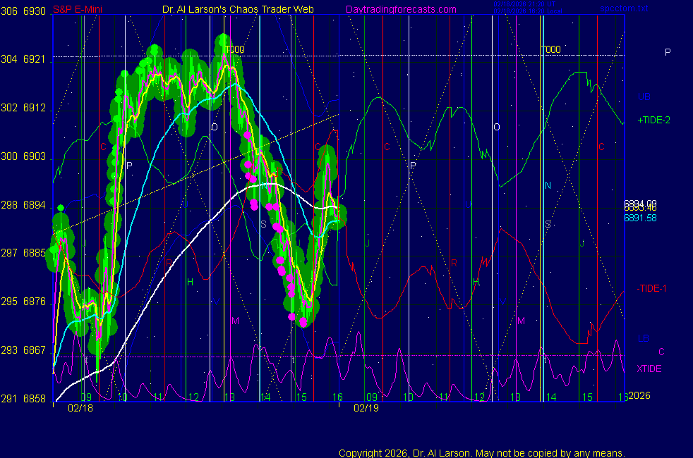 Today: as per char 3 on SPKISS page 10:04 440, 220, 110 down; sell 6833 stopped 6807 for +26 12:50 440, 220, 110 dipped, then up; buy 6855 covered 14:56 6872 for +17 Tomorrow: Moon conjoin Mercury **************************************************************************** during these volatile times, the point values in these instructions should multiplied by 5 ***************************************************************************** For trade times before 11:00, be sure to use EXMA's that include data from 8:15 Eastern Normal Rules ( as published on daytrading forecasts.com in the tutorial): These fit a Trend or Trend continuation scenario, identified by prices trading within a couple of points of the 110 minute EXMA, taking profits on a 12 point range. 1. Watch for the opportunity to go with the trend or change in trend at the time(s) given. Be alert for the turn coming early or late. Be patient and use the tracking indicators. Plan to trade in the direction of the 110 EXMA coming out of that time frame. Prices should stay on one side of the 110 EXMA and it should be moving, or curl up or down from a flat position. Prices should be within about 2 points of the 110 EXMA. The 20 minute EXMA should have crossed the 110 EXMA, or moved toward it and then pulled away from it. When this setup is clear, enter in the direction of the 110 EXMA with a 3 point stop. *** in volatile markets this may need to be 6 points If each setup is not clear 60 minutes after the given time, skip the trade. 2. Move the stop 1 point each 30 minutes. If the market moves decently, trail it by 3 points ( 6 points in volatile markets). 3. Cover on a 5 point gain**, 90 minutes after entry , at the next Tide turn , or if the prices clearly recross the 110 minute EXMA. ********************************************************************** **FAST MOVE RULE If the trade gains 3 points within 30 minutes of entry, press the stop, using the 20 EXMA as a guide to move the stop to the low or high of each pullback (normally about 15 minutes long) once the move makes a new high or low. Cover any gain of 9* points. *It is OK to use the fast stop rule if a trade starts fast, but to then cover at +5 or +4 if it slows or stalls *** Stall rule: Cover any trade that stalls for more than 45 minutes *** Carry through rule If you are in a trade that is working well, if is OK to carry through the next Tide turn *** GO BIG rule: if morning is a big move (>12 points ), and midday is a congestion or pullback, and the last trade of the day sets up near 2:00, a move greater than 9 points may be captured using the technique illustrated at http://moneytide.com/hans/cc09092008.asp *** VOLATILE MARKET RULE -use with discretion in volatile markets, the 55 minute EXMA used in place of the 110 minute EXMA may provide an earlier and lower risk entry. This is most useful when the market is extremely oversold or overbought and reversing, or during a fast move with minimal dips and one is looking to join the move. |