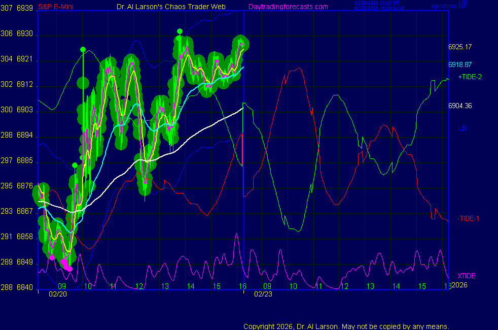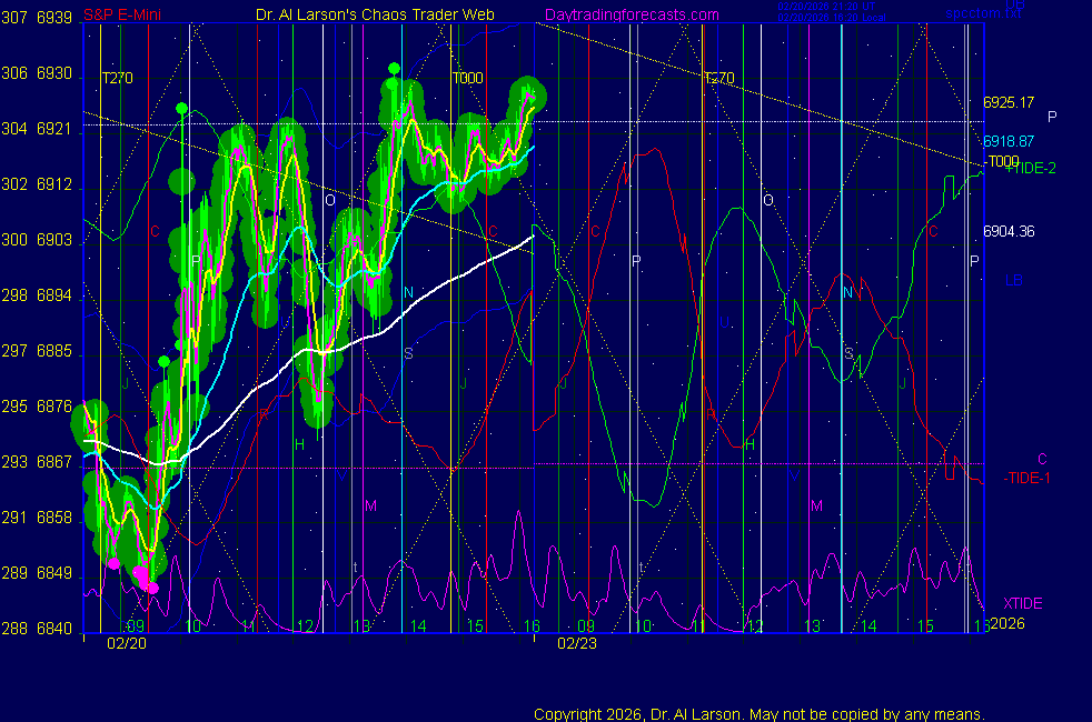 Today: as per chart 3 on SPKISS page 10:53 440 down,110 flat,220 up-passed 12:50 440, 220, 110 down; sell 6870 stopped for +10 14:55 440, 220, 110 down; sell 6862 stopped for +2 Tomorrow: Moon square Jupiter **************************************************************************** during these volatile times, the point values in these instructions should multiplied by 5 ***************************************************************************** For trade times before 11:00, be sure to use EXMA's that include data from 8:15 Eastern Normal Rules ( as published on daytrading forecasts.com in the tutorial): These fit a Trend or Trend continuation scenario, identified by prices trading within a couple of points of the 110 minute EXMA, taking profits on a 12 point range. 1. Watch for the opportunity to go with the trend or change in trend at the time(s) given. Be alert for the turn coming early or late. Be patient and use the tracking indicators. Plan to trade in the direction of the 110 EXMA coming out of that time frame. Prices should stay on one side of the 110 EXMA and it should be moving, or curl up or down from a flat position. Prices should be within about 2 points of the 110 EXMA. The 20 minute EXMA should have crossed the 110 EXMA, or moved toward it and then pulled away from it. When this setup is clear, enter in the direction of the 110 EXMA with a 3 point stop. *** in volatile markets this may need to be 6 points If each setup is not clear 60 minutes after the given time, skip the trade. 2. Move the stop 1 point each 30 minutes. If the market moves decently, trail it by 3 points ( 6 points in volatile markets). 3. Cover on a 5 point gain**, 90 minutes after entry , at the next Tide turn , or if the prices clearly recross the 110 minute EXMA. ********************************************************************** **FAST MOVE RULE If the trade gains 3 points within 30 minutes of entry, press the stop, using the 20 EXMA as a guide to move the stop to the low or high of each pullback (normally about 15 minutes long) once the move makes a new high or low. Cover any gain of 9* points. *It is OK to use the fast stop rule if a trade starts fast, but to then cover at +5 or +4 if it slows or stalls *** Stall rule: Cover any trade that stalls for more than 45 minutes *** Carry through rule If you are in a trade that is working well, if is OK to carry through the next Tide turn *** GO BIG rule: if morning is a big move (>12 points ), and midday is a congestion or pullback, and the last trade of the day sets up near 2:00, a move greater than 9 points may be captured using the technique illustrated at http://moneytide.com/hans/cc09092008.asp *** VOLATILE MARKET RULE -use with discretion in volatile markets, the 55 minute EXMA used in place of the 110 minute EXMA may provide an earlier and lower risk entry. This is most useful when the market is extremely oversold or overbought and reversing, or during a fast move with minimal dips and one is looking to join the move. |
