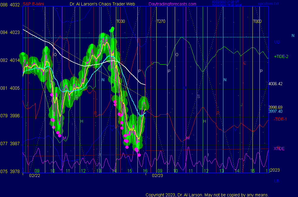 ___________________________________________________________________ charges for this hotline show up on your statement under MicroMedia that's the name of my business, owner of daytradingforecasts.com ___________________________________________________________________ Don't be intimidated by all the complexity of the astro stuff. Our approach is simple. Watch a simple chart, like SP1Day or SPKISS- with 3 minute bars, 20 minute (6 or 7 bars) EXMA, and 110 minute (36 bar) EXMA. Look at the trade times in the Strategy section below. When within about 45 minutes of the trade times, follow the rules given in the Standing Instructions. Keep it simple. Be patient. It works over time. Read the Trading the MoonTides Tutorial and Keep It Simple on the List of Charts page. Also read Finer Timing of the MoonTides, and Trading The MoonTide Rainbow. Check the upcoming Economic reports daily. They are linked on the left side of the ListOfCharts page under Economic News all times given are Eastern Ninja Traders: if your are a paying customer, you will see a link on top right side of ListOfCharts page to download the MoonTide indicator ******************************************************************* This is a very Chaotic market where the normal stops and targets will not work. But the EXMAs still do. They are good guides for stops. Targets 3 to 5 times normal are advised. Also, the 3 minute , 1 or 2 day charts may not show you all you need to know, so keep an eye on longer term charts, at least an hourly covering 4 weeks. !!! ******************************************************************** Today: by rule 09:53 440, 220, 110 down 20/110 sell 4045 carried through 13:02 stopped 4010 for +35 Tomorrow: Moon separating conjoin Venus **************************************************************************** during these volatile times, the point values in these instructions should multiplied by 5 ***************************************************************************** For trade times before 11:00, be sure to use EXMA's that include data from 8:15 Eastern Normal Rules ( as published on daytrading forecasts.com in the tutorial): These fit a Trend or Trend continuation scenario, identified by prices trading within a couple of points of the 110 minute EXMA, taking profits on a 12 point range. 1. Watch for the opportunity to go with the trend or change in trend at the time(s) given. Be alert for the turn coming early or late. Be patient and use the tracking indicators. Plan to trade in the direction of the 110 EXMA coming out of that time frame. Prices should stay on one side of the 110 EXMA and it should be moving, or curl up or down from a flat position. Prices should be within about 2 points of the 110 EXMA. The 20 minute EXMA should have crossed the 110 EXMA, or moved toward it and then pulled away from it. When this setup is clear, enter in the direction of the 110 EXMA with a 3 point stop. *** in volatile markets this may need to be 6 points If each setup is not clear 60 minutes after the given time, skip the trade. 2. Move the stop 1 point each 30 minutes. If the market moves decently, trail it by 3 points ( 6 points in volatile markets). 3. Cover on a 5 point gain**, 90 minutes after entry , at the next Tide turn , or if the prices clearly recross the 110 minute EXMA. ********************************************************************** **FAST MOVE RULE If the trade gains 3 points within 30 minutes of entry, press the stop, using the 20 EXMA as a guide to move the stop to the low or high of each pullback (normally about 15 minutes long) once the move makes a new high or low. Cover any gain of 9* points. *It is OK to use the fast stop rule if a trade starts fast, but to then cover at +5 or +4 if it slows or stalls *** Stall rule: Cover any trade that stalls for more than 45 minutes *** Carry through rule If you are in a trade that is working well, if is OK to carry through the next Tide turn *** GO BIG rule: if morning is a big move (>12 points ), and midday is a congestion or pullback, and the last trade of the day sets up near 2:00, a move greater than 9 points may be captured using the technique illustrated at http://moneytide.com/hans/cc09092008.asp *** VOLATILE MARKET RULE -use with discretion in volatile markets, the 55 minute EXMA used in place of the 110 minute EXMA may provide an earlier and lower risk entry. This is most useful when the market is extremely oversold or overbought and reversing, or during a fast move with minimal dips and one is looking to join the move. |