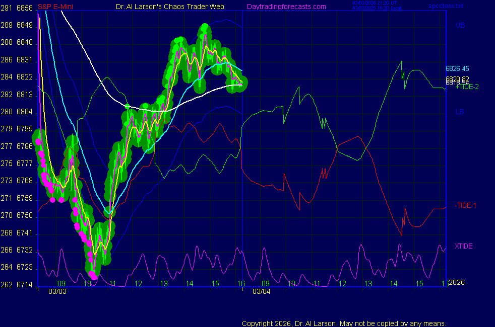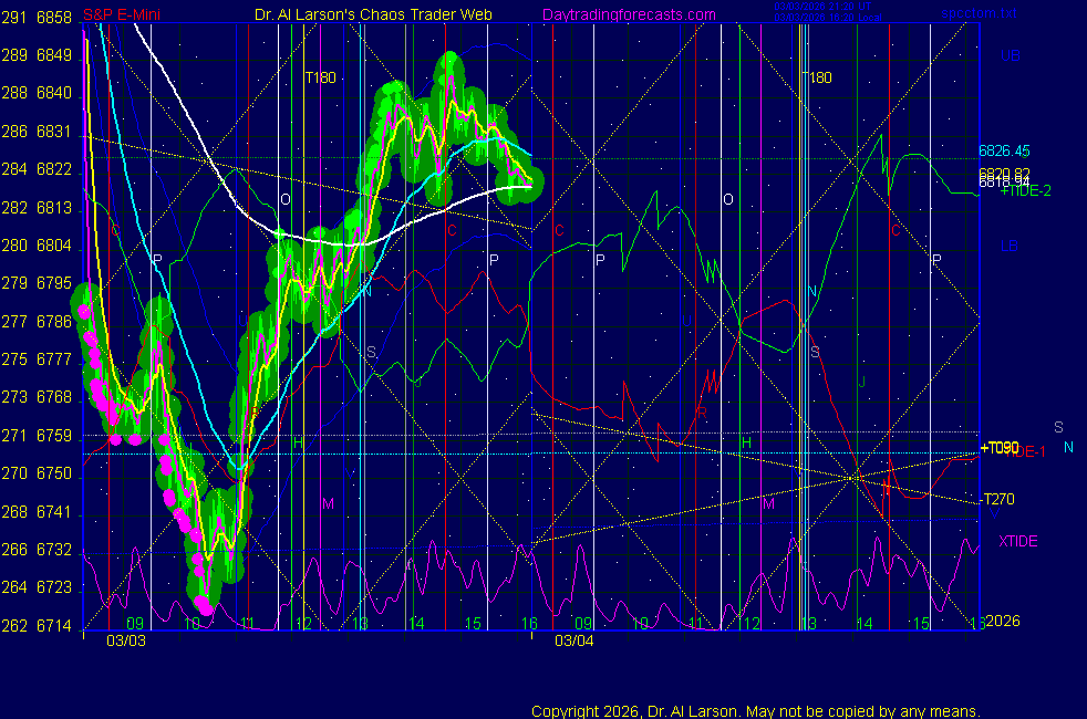 Today: as per chart 3 of SPKISS page 09:45 440, 220, 110 up; buy 6825 carried through 13:14; stopped 6892 for +67 Tomorrow: Moon oppose Sun **************************************************************************** during these volatile times, the point values in these instructions should multiplied by 5 ***************************************************************************** For trade times before 11:00, be sure to use EXMA's that include data from 8:15 Eastern Normal Rules ( as published on daytrading forecasts.com in the tutorial): These fit a Trend or Trend continuation scenario, identified by prices trading within a couple of points of the 110 minute EXMA, taking profits on a 12 point range. 1. Watch for the opportunity to go with the trend or change in trend at the time(s) given. Be alert for the turn coming early or late. Be patient and use the tracking indicators. Plan to trade in the direction of the 110 EXMA coming out of that time frame. Prices should stay on one side of the 110 EXMA and it should be moving, or curl up or down from a flat position. Prices should be within about 2 points of the 110 EXMA. The 20 minute EXMA should have crossed the 110 EXMA, or moved toward it and then pulled away from it. When this setup is clear, enter in the direction of the 110 EXMA with a 3 point stop. *** in volatile markets this may need to be 6 points If each setup is not clear 60 minutes after the given time, skip the trade. 2. Move the stop 1 point each 30 minutes. If the market moves decently, trail it by 3 points ( 6 points in volatile markets). 3. Cover on a 5 point gain**, 90 minutes after entry , at the next Tide turn , or if the prices clearly recross the 110 minute EXMA. ********************************************************************** **FAST MOVE RULE If the trade gains 3 points within 30 minutes of entry, press the stop, using the 20 EXMA as a guide to move the stop to the low or high of each pullback (normally about 15 minutes long) once the move makes a new high or low. Cover any gain of 9* points. *It is OK to use the fast stop rule if a trade starts fast, but to then cover at +5 or +4 if it slows or stalls *** Stall rule: Cover any trade that stalls for more than 45 minutes *** Carry through rule If you are in a trade that is working well, if is OK to carry through the next Tide turn *** GO BIG rule: if morning is a big move (>12 points ), and midday is a congestion or pullback, and the last trade of the day sets up near 2:00, a move greater than 9 points may be captured using the technique illustrated at http://moneytide.com/hans/cc09092008.asp *** VOLATILE MARKET RULE -use with discretion in volatile markets, the 55 minute EXMA used in place of the 110 minute EXMA may provide an earlier and lower risk entry. This is most useful when the market is extremely oversold or overbought and reversing, or during a fast move with minimal dips and one is looking to join the move. |