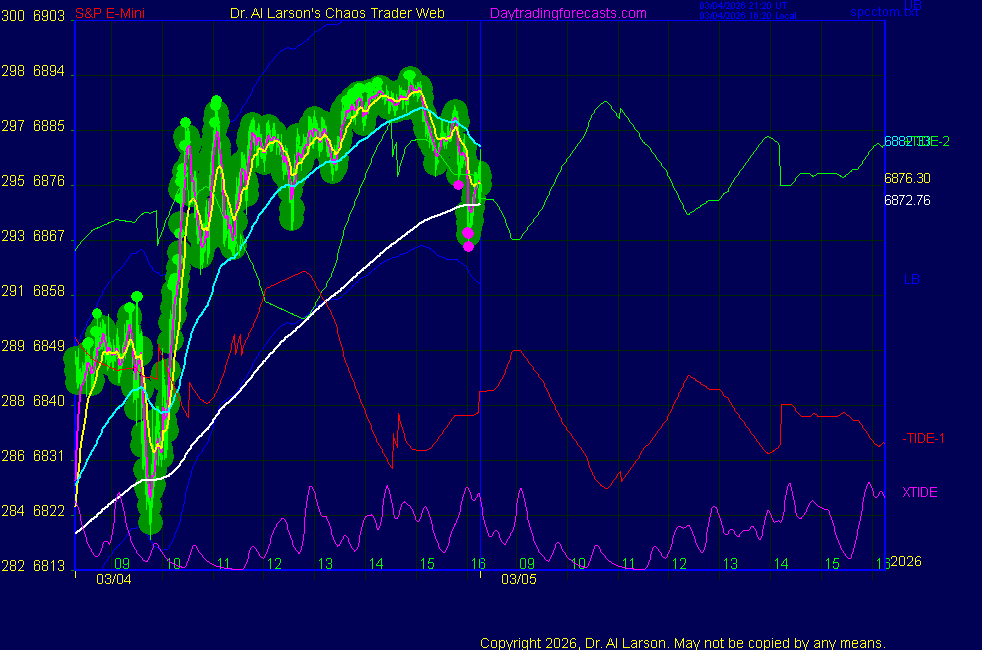 Today: as per chart 3 of SPKISS page chart 1 was good too 09:31 440,220,110 down; sell 6760 stopped 6741 for +19 13:16 440, 220, 110 up; buy 6813 stopped 6831 for +18 Tomorrow: Moon oppose Saturn/Neptune/Venus **************************************************************************** during these volatile times, the point values in these instructions should multiplied by 5 ***************************************************************************** For trade times before 11:00, be sure to use EXMA's that include data from 8:15 Eastern Normal Rules ( as published on daytrading forecasts.com in the tutorial): These fit a Trend or Trend continuation scenario, identified by prices trading within a couple of points of the 110 minute EXMA, taking profits on a 12 point range. 1. Watch for the opportunity to go with the trend or change in trend at the time(s) given. Be alert for the turn coming early or late. Be patient and use the tracking indicators. Plan to trade in the direction of the 110 EXMA coming out of that time frame. Prices should stay on one side of the 110 EXMA and it should be moving, or curl up or down from a flat position. Prices should be within about 2 points of the 110 EXMA. The 20 minute EXMA should have crossed the 110 EXMA, or moved toward it and then pulled away from it. When this setup is clear, enter in the direction of the 110 EXMA with a 3 point stop. *** in volatile markets this may need to be 6 points If each setup is not clear 60 minutes after the given time, skip the trade. 2. Move the stop 1 point each 30 minutes. If the market moves decently, trail it by 3 points ( 6 points in volatile markets). 3. Cover on a 5 point gain**, 90 minutes after entry , at the next Tide turn , or if the prices clearly recross the 110 minute EXMA. ********************************************************************** **FAST MOVE RULE If the trade gains 3 points within 30 minutes of entry, press the stop, using the 20 EXMA as a guide to move the stop to the low or high of each pullback (normally about 15 minutes long) once the move makes a new high or low. Cover any gain of 9* points. *It is OK to use the fast stop rule if a trade starts fast, but to then cover at +5 or +4 if it slows or stalls *** Stall rule: Cover any trade that stalls for more than 45 minutes *** Carry through rule If you are in a trade that is working well, if is OK to carry through the next Tide turn *** GO BIG rule: if morning is a big move (>12 points ), and midday is a congestion or pullback, and the last trade of the day sets up near 2:00, a move greater than 9 points may be captured using the technique illustrated at http://moneytide.com/hans/cc09092008.asp *** VOLATILE MARKET RULE -use with discretion in volatile markets, the 55 minute EXMA used in place of the 110 minute EXMA may provide an earlier and lower risk entry. This is most useful when the market is extremely oversold or overbought and reversing, or during a fast move with minimal dips and one is looking to join the move. |