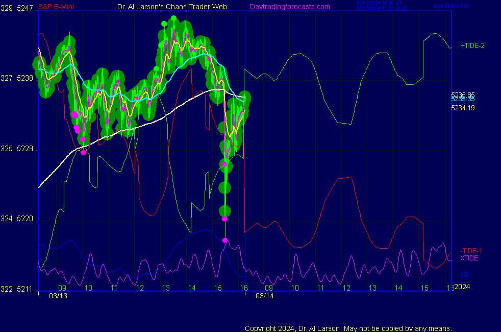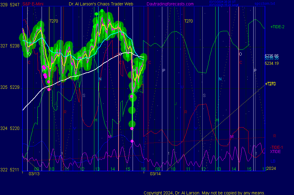 MoonTide Trades: by rule 09:31 440 up, 220 ans 110 dipped, then up ; 110/20 buy 5208 carried through 11:28 stopped 5226 for +18 14:17 440, 220, 110 up 20/110 buy 5232 stopped for +6 Tomorrow: Moon conjoin Jupiter **************************************************************************** during these volatile times, the point values in these instructions should multiplied by 5 ***************************************************************************** For trade times before 11:00, be sure to use EXMA's that include data from 8:15 Eastern Normal Rules ( as published on daytrading forecasts.com in the tutorial): These fit a Trend or Trend continuation scenario, identified by prices trading within a couple of points of the 110 minute EXMA, taking profits on a 12 point range. 1. Watch for the opportunity to go with the trend or change in trend at the time(s) given. Be alert for the turn coming early or late. Be patient and use the tracking indicators. Plan to trade in the direction of the 110 EXMA coming out of that time frame. Prices should stay on one side of the 110 EXMA and it should be moving, or curl up or down from a flat position. Prices should be within about 2 points of the 110 EXMA. The 20 minute EXMA should have crossed the 110 EXMA, or moved toward it and then pulled away from it. When this setup is clear, enter in the direction of the 110 EXMA with a 3 point stop. *** in volatile markets this may need to be 6 points If each setup is not clear 60 minutes after the given time, skip the trade. 2. Move the stop 1 point each 30 minutes. If the market moves decently, trail it by 3 points ( 6 points in volatile markets). 3. Cover on a 5 point gain**, 90 minutes after entry , at the next Tide turn , or if the prices clearly recross the 110 minute EXMA. ********************************************************************** **FAST MOVE RULE If the trade gains 3 points within 30 minutes of entry, press the stop, using the 20 EXMA as a guide to move the stop to the low or high of each pullback (normally about 15 minutes long) once the move makes a new high or low. Cover any gain of 9* points. *It is OK to use the fast stop rule if a trade starts fast, but to then cover at +5 or +4 if it slows or stalls *** Stall rule: Cover any trade that stalls for more than 45 minutes *** Carry through rule If you are in a trade that is working well, if is OK to carry through the next Tide turn *** GO BIG rule: if morning is a big move (>12 points ), and midday is a congestion or pullback, and the last trade of the day sets up near 2:00, a move greater than 9 points may be captured using the technique illustrated at http://moneytide.com/hans/cc09092008.asp *** VOLATILE MARKET RULE -use with discretion in volatile markets, the 55 minute EXMA used in place of the 110 minute EXMA may provide an earlier and lower risk entry. This is most useful when the market is extremely oversold or overbought and reversing, or during a fast move with minimal dips and one is looking to join the move. |
