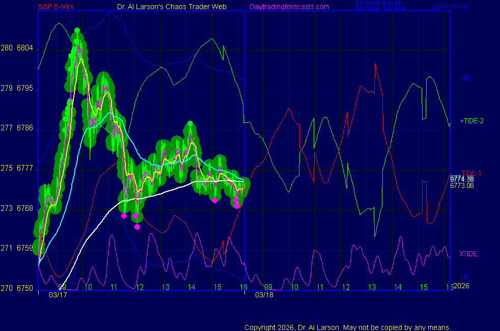 Today: as per chart 3 on SPKISS due to an error charts today were still on March contract tomorrow they should be on June contract 09:31 440, 220, 110 up; bought 6705 stopped 6716 for +11 12:13 440 up, 110 down - passed Tomorrow: Moon conjoin Mercury, Mars, Node **************************************************************************** during these volatile times, the point values in these instructions should multiplied by 5 ***************************************************************************** For trade times before 11:00, be sure to use EXMA's that include data from 8:15 Eastern Normal Rules ( as published on daytrading forecasts.com in the tutorial): These fit a Trend or Trend continuation scenario, identified by prices trading within a couple of points of the 110 minute EXMA, taking profits on a 12 point range. 1. Watch for the opportunity to go with the trend or change in trend at the time(s) given. Be alert for the turn coming early or late. Be patient and use the tracking indicators. Plan to trade in the direction of the 110 EXMA coming out of that time frame. Prices should stay on one side of the 110 EXMA and it should be moving, or curl up or down from a flat position. Prices should be within about 2 points of the 110 EXMA. The 20 minute EXMA should have crossed the 110 EXMA, or moved toward it and then pulled away from it. When this setup is clear, enter in the direction of the 110 EXMA with a 3 point stop. *** in volatile markets this may need to be 6 points If each setup is not clear 60 minutes after the given time, skip the trade. 2. Move the stop 1 point each 30 minutes. If the market moves decently, trail it by 3 points ( 6 points in volatile markets). 3. Cover on a 5 point gain**, 90 minutes after entry , at the next Tide turn , or if the prices clearly recross the 110 minute EXMA. ********************************************************************** **FAST MOVE RULE If the trade gains 3 points within 30 minutes of entry, press the stop, using the 20 EXMA as a guide to move the stop to the low or high of each pullback (normally about 15 minutes long) once the move makes a new high or low. Cover any gain of 9* points. *It is OK to use the fast stop rule if a trade starts fast, but to then cover at +5 or +4 if it slows or stalls *** Stall rule: Cover any trade that stalls for more than 45 minutes *** Carry through rule If you are in a trade that is working well, if is OK to carry through the next Tide turn *** GO BIG rule: if morning is a big move (>12 points ), and midday is a congestion or pullback, and the last trade of the day sets up near 2:00, a move greater than 9 points may be captured using the technique illustrated at http://moneytide.com/hans/cc09092008.asp *** VOLATILE MARKET RULE -use with discretion in volatile markets, the 55 minute EXMA used in place of the 110 minute EXMA may provide an earlier and lower risk entry. This is most useful when the market is extremely oversold or overbought and reversing, or during a fast move with minimal dips and one is looking to join the move. |