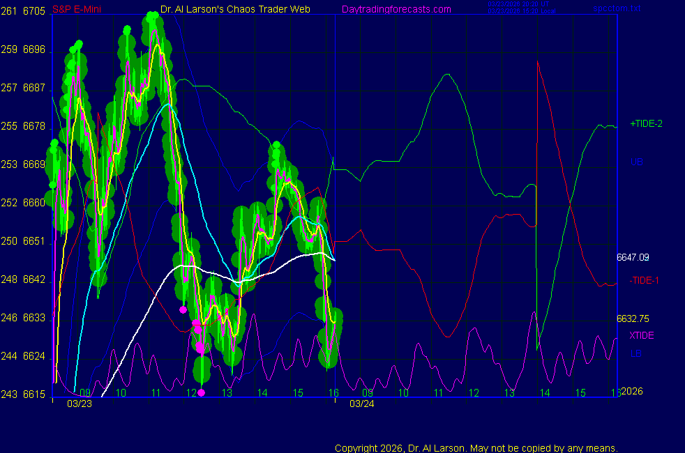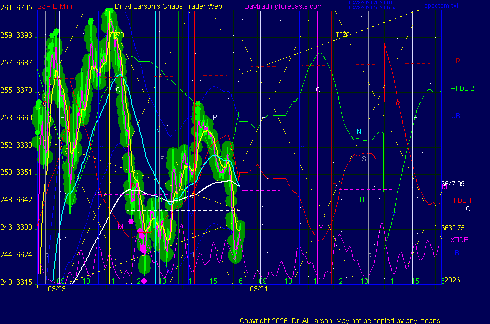 Today: as per the Chaos Clinic 10:14 440, 220, 110 down; sell 6630 carried through 12:02 stopped 6614 for +16 14:23 440, 220, 110 down; sell 6599 covered 6560 for +39 Tomorrow: Moon conjoin Uranus, square Node and Mercury **************************************************************************** during these volatile times, the point values in these instructions should multiplied by 5 ***************************************************************************** For trade times before 11:00, be sure to use EXMA's that include data from 8:15 Eastern Normal Rules ( as published on daytrading forecasts.com in the tutorial): These fit a Trend or Trend continuation scenario, identified by prices trading within a couple of points of the 110 minute EXMA, taking profits on a 12 point range. 1. Watch for the opportunity to go with the trend or change in trend at the time(s) given. Be alert for the turn coming early or late. Be patient and use the tracking indicators. Plan to trade in the direction of the 110 EXMA coming out of that time frame. Prices should stay on one side of the 110 EXMA and it should be moving, or curl up or down from a flat position. Prices should be within about 2 points of the 110 EXMA. The 20 minute EXMA should have crossed the 110 EXMA, or moved toward it and then pulled away from it. When this setup is clear, enter in the direction of the 110 EXMA with a 3 point stop. *** in volatile markets this may need to be 6 points If each setup is not clear 60 minutes after the given time, skip the trade. 2. Move the stop 1 point each 30 minutes. If the market moves decently, trail it by 3 points ( 6 points in volatile markets). 3. Cover on a 5 point gain**, 90 minutes after entry , at the next Tide turn , or if the prices clearly recross the 110 minute EXMA. ********************************************************************** **FAST MOVE RULE If the trade gains 3 points within 30 minutes of entry, press the stop, using the 20 EXMA as a guide to move the stop to the low or high of each pullback (normally about 15 minutes long) once the move makes a new high or low. Cover any gain of 9* points. *It is OK to use the fast stop rule if a trade starts fast, but to then cover at +5 or +4 if it slows or stalls *** Stall rule: Cover any trade that stalls for more than 45 minutes *** Carry through rule If you are in a trade that is working well, if is OK to carry through the next Tide turn *** GO BIG rule: if morning is a big move (>12 points ), and midday is a congestion or pullback, and the last trade of the day sets up near 2:00, a move greater than 9 points may be captured using the technique illustrated at http://moneytide.com/hans/cc09092008.asp *** VOLATILE MARKET RULE -use with discretion in volatile markets, the 55 minute EXMA used in place of the 110 minute EXMA may provide an earlier and lower risk entry. This is most useful when the market is extremely oversold or overbought and reversing, or during a fast move with minimal dips and one is looking to join the move. |