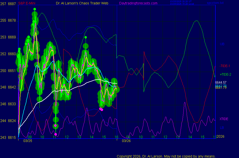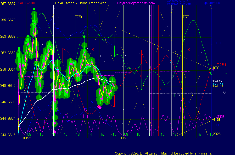 Today: as per chart 3 of the SPKISS page 11:32 440, 220, 110 up; buy 6623 stopped 6634 for +11 14:01 440, 220, 110 up; buy 6625 stopped for 0 Tomorrow: Moon square Sun/Saturn **************************************************************************** during these volatile times, the point values in these instructions should multiplied by 5 ***************************************************************************** For trade times before 11:00, be sure to use EXMA's that include data from 8:15 Eastern Normal Rules ( as published on daytrading forecasts.com in the tutorial): These fit a Trend or Trend continuation scenario, identified by prices trading within a couple of points of the 110 minute EXMA, taking profits on a 12 point range. 1. Watch for the opportunity to go with the trend or change in trend at the time(s) given. Be alert for the turn coming early or late. Be patient and use the tracking indicators. Plan to trade in the direction of the 110 EXMA coming out of that time frame. Prices should stay on one side of the 110 EXMA and it should be moving, or curl up or down from a flat position. Prices should be within about 2 points of the 110 EXMA. The 20 minute EXMA should have crossed the 110 EXMA, or moved toward it and then pulled away from it. When this setup is clear, enter in the direction of the 110 EXMA with a 3 point stop. *** in volatile markets this may need to be 6 points If each setup is not clear 60 minutes after the given time, skip the trade. 2. Move the stop 1 point each 30 minutes. If the market moves decently, trail it by 3 points ( 6 points in volatile markets). 3. Cover on a 5 point gain**, 90 minutes after entry , at the next Tide turn , or if the prices clearly recross the 110 minute EXMA. ********************************************************************** **FAST MOVE RULE If the trade gains 3 points within 30 minutes of entry, press the stop, using the 20 EXMA as a guide to move the stop to the low or high of each pullback (normally about 15 minutes long) once the move makes a new high or low. Cover any gain of 9* points. *It is OK to use the fast stop rule if a trade starts fast, but to then cover at +5 or +4 if it slows or stalls *** Stall rule: Cover any trade that stalls for more than 45 minutes *** Carry through rule If you are in a trade that is working well, if is OK to carry through the next Tide turn *** GO BIG rule: if morning is a big move (>12 points ), and midday is a congestion or pullback, and the last trade of the day sets up near 2:00, a move greater than 9 points may be captured using the technique illustrated at http://moneytide.com/hans/cc09092008.asp *** VOLATILE MARKET RULE -use with discretion in volatile markets, the 55 minute EXMA used in place of the 110 minute EXMA may provide an earlier and lower risk entry. This is most useful when the market is extremely oversold or overbought and reversing, or during a fast move with minimal dips and one is looking to join the move. |