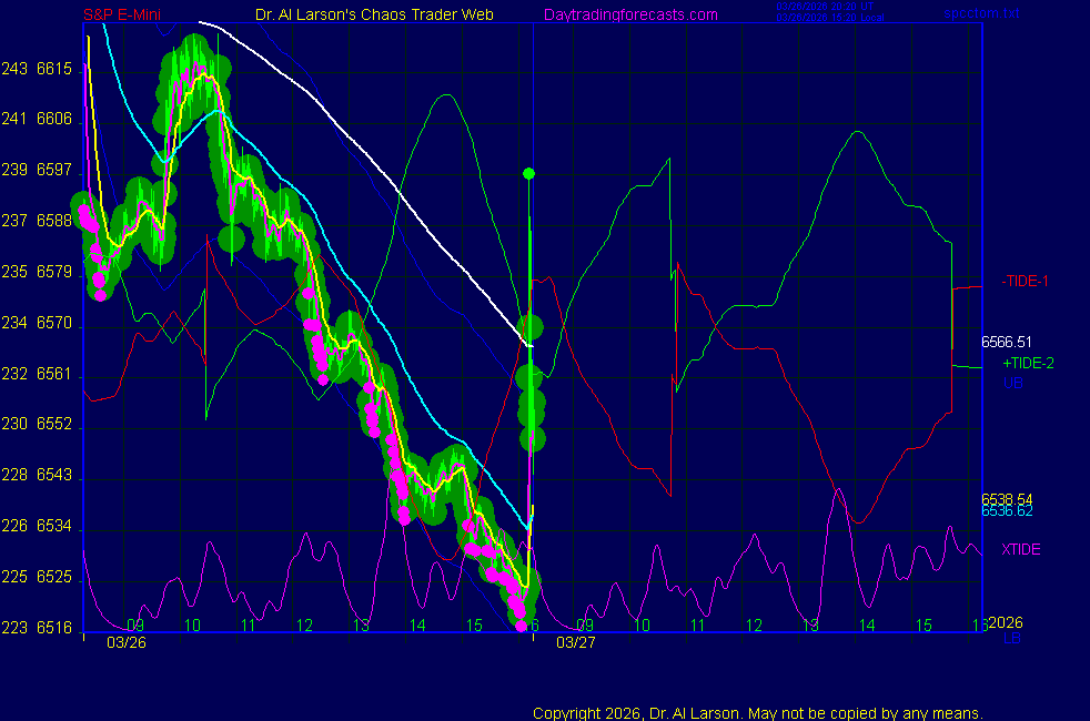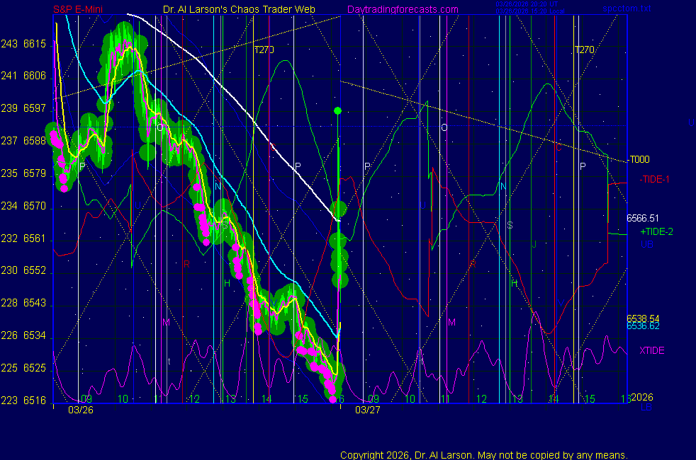 Today: as per chart 3 of the SPKISS page 10:14 440, 220 up, 110 dipped, then up; buy 6656 stopped for +2 11:58 440 up, 220 and 11 down -passed 14:21 440,220,110 down; sold 6648 covered for +10 Tomorrow: Moon conjoin Jupiter, square Venus/Chiron **************************************************************************** during these volatile times, the point values in these instructions should multiplied by 5 ***************************************************************************** For trade times before 11:00, be sure to use EXMA's that include data from 8:15 Eastern Normal Rules ( as published on daytrading forecasts.com in the tutorial): These fit a Trend or Trend continuation scenario, identified by prices trading within a couple of points of the 110 minute EXMA, taking profits on a 12 point range. 1. Watch for the opportunity to go with the trend or change in trend at the time(s) given. Be alert for the turn coming early or late. Be patient and use the tracking indicators. Plan to trade in the direction of the 110 EXMA coming out of that time frame. Prices should stay on one side of the 110 EXMA and it should be moving, or curl up or down from a flat position. Prices should be within about 2 points of the 110 EXMA. The 20 minute EXMA should have crossed the 110 EXMA, or moved toward it and then pulled away from it. When this setup is clear, enter in the direction of the 110 EXMA with a 3 point stop. *** in volatile markets this may need to be 6 points If each setup is not clear 60 minutes after the given time, skip the trade. 2. Move the stop 1 point each 30 minutes. If the market moves decently, trail it by 3 points ( 6 points in volatile markets). 3. Cover on a 5 point gain**, 90 minutes after entry , at the next Tide turn , or if the prices clearly recross the 110 minute EXMA. ********************************************************************** **FAST MOVE RULE If the trade gains 3 points within 30 minutes of entry, press the stop, using the 20 EXMA as a guide to move the stop to the low or high of each pullback (normally about 15 minutes long) once the move makes a new high or low. Cover any gain of 9* points. *It is OK to use the fast stop rule if a trade starts fast, but to then cover at +5 or +4 if it slows or stalls *** Stall rule: Cover any trade that stalls for more than 45 minutes *** Carry through rule If you are in a trade that is working well, if is OK to carry through the next Tide turn *** GO BIG rule: if morning is a big move (>12 points ), and midday is a congestion or pullback, and the last trade of the day sets up near 2:00, a move greater than 9 points may be captured using the technique illustrated at http://moneytide.com/hans/cc09092008.asp *** VOLATILE MARKET RULE -use with discretion in volatile markets, the 55 minute EXMA used in place of the 110 minute EXMA may provide an earlier and lower risk entry. This is most useful when the market is extremely oversold or overbought and reversing, or during a fast move with minimal dips and one is looking to join the move. |