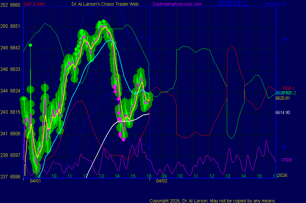 Today: as per chart 3 on SPKISS page 10:51 440, 220, 110 up; bought 6473 exploded passing Moon oppose Mars ( 11:55 ) stopped 6543 for +70 13:12 440, 220, 110 up; bought 6544 carried through 14:59; covered 6574 for +30 Tomorrow: Moon oppose Saturn, square Jupiter **************************************************************************** during these volatile times, the point values in these instructions should multiplied by 5 ***************************************************************************** For trade times before 11:00, be sure to use EXMA's that include data from 8:15 Eastern Normal Rules ( as published on daytrading forecasts.com in the tutorial): These fit a Trend or Trend continuation scenario, identified by prices trading within a couple of points of the 110 minute EXMA, taking profits on a 12 point range. 1. Watch for the opportunity to go with the trend or change in trend at the time(s) given. Be alert for the turn coming early or late. Be patient and use the tracking indicators. Plan to trade in the direction of the 110 EXMA coming out of that time frame. Prices should stay on one side of the 110 EXMA and it should be moving, or curl up or down from a flat position. Prices should be within about 2 points of the 110 EXMA. The 20 minute EXMA should have crossed the 110 EXMA, or moved toward it and then pulled away from it. When this setup is clear, enter in the direction of the 110 EXMA with a 3 point stop. *** in volatile markets this may need to be 6 points If each setup is not clear 60 minutes after the given time, skip the trade. 2. Move the stop 1 point each 30 minutes. If the market moves decently, trail it by 3 points ( 6 points in volatile markets). 3. Cover on a 5 point gain**, 90 minutes after entry , at the next Tide turn , or if the prices clearly recross the 110 minute EXMA. ********************************************************************** **FAST MOVE RULE If the trade gains 3 points within 30 minutes of entry, press the stop, using the 20 EXMA as a guide to move the stop to the low or high of each pullback (normally about 15 minutes long) once the move makes a new high or low. Cover any gain of 9* points. *It is OK to use the fast stop rule if a trade starts fast, but to then cover at +5 or +4 if it slows or stalls *** Stall rule: Cover any trade that stalls for more than 45 minutes *** Carry through rule If you are in a trade that is working well, if is OK to carry through the next Tide turn *** GO BIG rule: if morning is a big move (>12 points ), and midday is a congestion or pullback, and the last trade of the day sets up near 2:00, a move greater than 9 points may be captured using the technique illustrated at http://moneytide.com/hans/cc09092008.asp *** VOLATILE MARKET RULE -use with discretion in volatile markets, the 55 minute EXMA used in place of the 110 minute EXMA may provide an earlier and lower risk entry. This is most useful when the market is extremely oversold or overbought and reversing, or during a fast move with minimal dips and one is looking to join the move. |