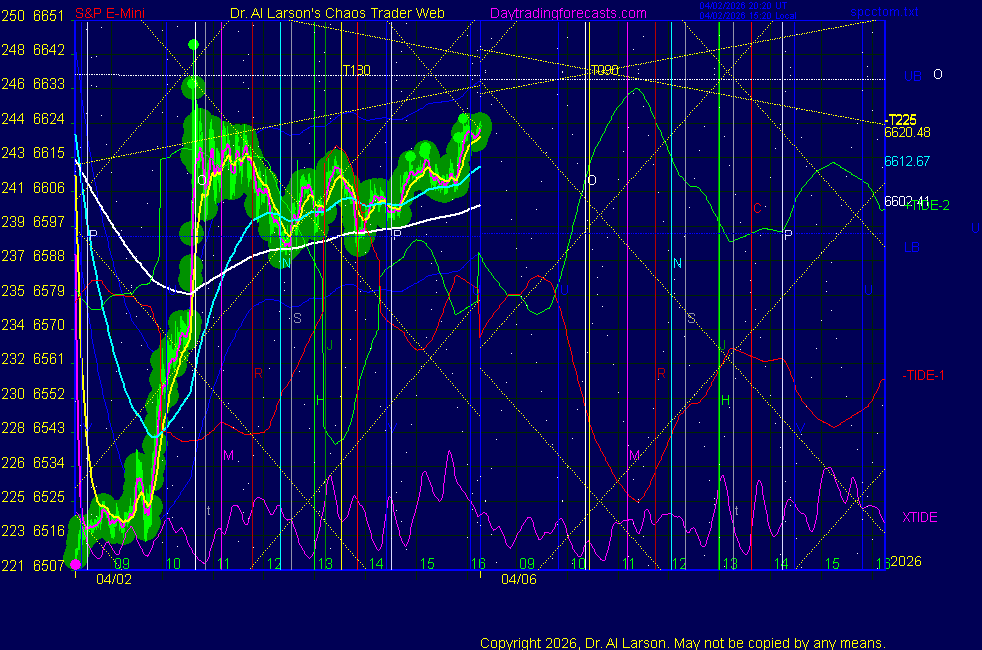 Today: as per chart 3 on SPKISS page 09:41 440,220,110 up; bought 6610 carried through 12:02 covered 6651 for +41 14:50 440, 220, 110 turned down; sold 5440 stopped 6615 for +25 Tomorrow: Moon square Jupiter, oppose Chiron **************************************************************************** during these volatile times, the point values in these instructions should multiplied by 5 ***************************************************************************** For trade times before 11:00, be sure to use EXMA's that include data from 8:15 Eastern Normal Rules ( as published on daytrading forecasts.com in the tutorial): These fit a Trend or Trend continuation scenario, identified by prices trading within a couple of points of the 110 minute EXMA, taking profits on a 12 point range. 1. Watch for the opportunity to go with the trend or change in trend at the time(s) given. Be alert for the turn coming early or late. Be patient and use the tracking indicators. Plan to trade in the direction of the 110 EXMA coming out of that time frame. Prices should stay on one side of the 110 EXMA and it should be moving, or curl up or down from a flat position. Prices should be within about 2 points of the 110 EXMA. The 20 minute EXMA should have crossed the 110 EXMA, or moved toward it and then pulled away from it. When this setup is clear, enter in the direction of the 110 EXMA with a 3 point stop. *** in volatile markets this may need to be 6 points If each setup is not clear 60 minutes after the given time, skip the trade. 2. Move the stop 1 point each 30 minutes. If the market moves decently, trail it by 3 points ( 6 points in volatile markets). 3. Cover on a 5 point gain**, 90 minutes after entry , at the next Tide turn , or if the prices clearly recross the 110 minute EXMA. ********************************************************************** **FAST MOVE RULE If the trade gains 3 points within 30 minutes of entry, press the stop, using the 20 EXMA as a guide to move the stop to the low or high of each pullback (normally about 15 minutes long) once the move makes a new high or low. Cover any gain of 9* points. *It is OK to use the fast stop rule if a trade starts fast, but to then cover at +5 or +4 if it slows or stalls *** Stall rule: Cover any trade that stalls for more than 45 minutes *** Carry through rule If you are in a trade that is working well, if is OK to carry through the next Tide turn *** GO BIG rule: if morning is a big move (>12 points ), and midday is a congestion or pullback, and the last trade of the day sets up near 2:00, a move greater than 9 points may be captured using the technique illustrated at http://moneytide.com/hans/cc09092008.asp *** VOLATILE MARKET RULE -use with discretion in volatile markets, the 55 minute EXMA used in place of the 110 minute EXMA may provide an earlier and lower risk entry. This is most useful when the market is extremely oversold or overbought and reversing, or during a fast move with minimal dips and one is looking to join the move. |