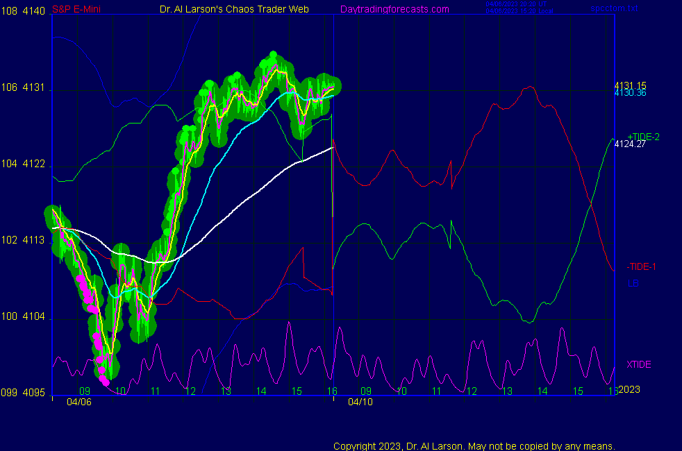 ___________________________________________________________________ charges for this hotline show up on your statement under MicroMedia that's the name of my business, owner of daytradingforecasts.com ___________________________________________________________________ Don't be intimidated by all the complexity of the astro stuff. Our approach is simple. Watch a simple chart, like SP1Day or SPKISS- with 3 minute bars, 20 minute (6 or 7 bars) EXMA, and 110 minute (36 bar) EXMA. Look at the trade times in the Strategy section below. When within about 45 minutes of the trade times, follow the rules given in the Standing Instructions. Keep it simple. Be patient. It works over time. Read the Trading the MoonTides Tutorial and Keep It Simple on the List of Charts page. Also read Finer Timing of the MoonTides, and Trading The MoonTide Rainbow. Check the upcoming Economic reports daily. They are linked on the left side of the ListOfCharts page under Economic News all times given are Eastern Ninja Traders: if your are a paying customer, you will see a link on top right side of ListOfCharts page to download the MoonTide indicator ******************************************************************* This is a very Chaotic market where the normal stops and targets will not work. But the EXMAs still do. They are good guides for stops. Targets 3 to 5 times normal are advised. Also, the 3 minute , 1 or 2 day charts may not show you all you need to know, so keep an eye on longer term charts, at least an hourly covering 4 weeks. !!! ******************************************************************** Today: by rule 09:50 440, 220, 110 down 20/110 sell 4120 stopped for +15 14:12 110, 220 up, 440 flat so passed Tomorrow: Moon oppose Jupiter, square Pluto **************************************************************************** during these volatile times, the point values in these instructions should multiplied by 5 ***************************************************************************** For trade times before 11:00, be sure to use EXMA's that include data from 8:15 Eastern Normal Rules ( as published on daytrading forecasts.com in the tutorial): These fit a Trend or Trend continuation scenario, identified by prices trading within a couple of points of the 110 minute EXMA, taking profits on a 12 point range. 1. Watch for the opportunity to go with the trend or change in trend at the time(s) given. Be alert for the turn coming early or late. Be patient and use the tracking indicators. Plan to trade in the direction of the 110 EXMA coming out of that time frame. Prices should stay on one side of the 110 EXMA and it should be moving, or curl up or down from a flat position. Prices should be within about 2 points of the 110 EXMA. The 20 minute EXMA should have crossed the 110 EXMA, or moved toward it and then pulled away from it. When this setup is clear, enter in the direction of the 110 EXMA with a 3 point stop. *** in volatile markets this may need to be 6 points If each setup is not clear 60 minutes after the given time, skip the trade. 2. Move the stop 1 point each 30 minutes. If the market moves decently, trail it by 3 points ( 6 points in volatile markets). 3. Cover on a 5 point gain**, 90 minutes after entry , at the next Tide turn , or if the prices clearly recross the 110 minute EXMA. ********************************************************************** **FAST MOVE RULE If the trade gains 3 points within 30 minutes of entry, press the stop, using the 20 EXMA as a guide to move the stop to the low or high of each pullback (normally about 15 minutes long) once the move makes a new high or low. Cover any gain of 9* points. *It is OK to use the fast stop rule if a trade starts fast, but to then cover at +5 or +4 if it slows or stalls *** Stall rule: Cover any trade that stalls for more than 45 minutes *** Carry through rule If you are in a trade that is working well, if is OK to carry through the next Tide turn *** GO BIG rule: if morning is a big move (>12 points ), and midday is a congestion or pullback, and the last trade of the day sets up near 2:00, a move greater than 9 points may be captured using the technique illustrated at http://moneytide.com/hans/cc09092008.asp *** VOLATILE MARKET RULE -use with discretion in volatile markets, the 55 minute EXMA used in place of the 110 minute EXMA may provide an earlier and lower risk entry. This is most useful when the market is extremely oversold or overbought and reversing, or during a fast move with minimal dips and one is looking to join the move. |