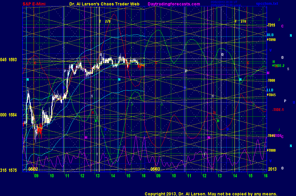 ___________________________________________________________________ Don't be intimidated by all the complexity of the astro stuff. Our approach is simple. Watch a simple chart, like SP1Day or SPKISS- with 3 minute bars, 20 minute (6 or 7 bars) EXMA, and 110 minute (36 bar) EXMA. Look at the trade times in the Strategy section below. When within about ±45 minutes of the trade times, follow the rules given in the Standing Instructions. Keep it simple. Be patient. It works over time. Read the Trading the MoonTides Tutorial and Keep It Simple on the List of Charts page. Also read Finer Timing of the MoonTides, and Trading The MoonTide Rainbow. Check the upcoming Economic reports daily. They are linked on the left side of the ListOfCharts page under Economic News all times given are Eastern Ninja Traders: http://moneytide.com/download/MoonTide052013.zip Today: Win2Day Trades: by rule 10:26 sold 1584.75 stopped for +.5 13:08 bought 1588 covered on stall for +1 14:30 passed -trading both sides ********************************* Strategy: (this, a simple chart, and the Standing Instructions are all you really need to trade) be careful about making things up - if there is no juice, don't jump Remember, *********** chaos follows dullness !!!!!!!!!! Tomorrow: Moon square Mercury and Saturn <***> MoonTide Times and Trade Times<***> For trade times before 11:00, be sure to use EXMA's that include data from 8:15 Eastern Normal Rules ( as published on daytrading forecasts.com in the tutorial): These fit a Trend or Trend continuation scenario, identified by prices trading within a couple of points of the 110 minute EXMA, taking profits on a 12 point range. 1. Watch for the opportunity to go with the trend or change in trend at the time(s) given. Be alert for the turn coming early or late. Be patient and use the tracking indicators. Plan to trade in the direction of the 110 EXMA coming out of that time frame. Prices should stay on one side of the 110 EXMA and it should be moving, or curl up or down from a flat position. Prices should be within about 2 points of the 110 EXMA. The 20 minute EXMA should have crossed the 110 EXMA, or moved toward it and then pulled away from it. When this setup is clear, enter in the direction of the 110 EXMA with a 3 point stop. *** in volatile markets this may need to be 6 points If each setup is not clear 60 minutes after the given time, skip the trade. 2. Move the stop 1 point each 30 minutes. If the market moves decently, trail it by 3 points ( 6 points in volatile markets). 3. Cover on a 5 point gain**, 90 minutes after entry , at the next Tide turn , or if the prices clearly recross the 110 minute EXMA. ********************************************************************** **FAST MOVE RULE If the trade gains 3 points within 30 minutes of entry, press the stop, using the 20 EXMA as a guide to move the stop to the low or high of each pullback (normally about 15 minutes long) once the move makes a new high or low. Cover any gain of 9* points. *It is OK to use the fast stop rule if a trade starts fast, but to then cover at +5 or +4 if it slows or stalls *** Stall rule: Cover any trade that stalls for more than 45 minutes *** Carry through rule If you are in a trade that is working well, if is OK to carry through the next Tide turn *** GO BIG rule: if morning is a big move (>12 points ), and midday is a congestion or pullback, and the last trade of the day sets up near 2:00, a move greater than 9 points may be captured using the technique illustrated at http://moneytide.com/hans/cc09092008.asp *** VOLATILE MARKET RULE -use with discretion in volatile markets, the 55 minute EXMA used in place of the 110 minute EXMA may provide an earlier and lower risk entry. This is most useful when the market is extremely oversold or overbought and reversing, or during a fast move with minimal dips and one is looking to join the move. |