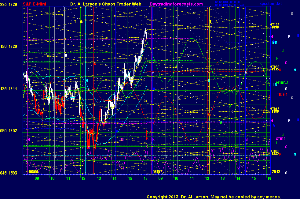 ___________________________________________________________________ Don't be intimidated by all the complexity of the astro stuff. Our approach is simple. Watch a simple chart, like SP1Day or SPKISS- with 3 minute bars, 20 minute (6 or 7 bars) EXMA, and 110 minute (36 bar) EXMA. Look at the trade times in the Strategy section below. When within about ±45 minutes of the trade times, follow the rules given in the Standing Instructions. Keep it simple. Be patient. It works over time. Read the Trading the MoonTides Tutorial and Keep It Simple on the List of Charts page. Also read Finer Timing of the MoonTides, and Trading The MoonTide Rainbow. Check the upcoming Economic reports daily. They are linked on the left side of the ListOfCharts page under Economic News all times given are Eastern Ninja Traders: if your are a paying customer, you will see a link on top right side of ListOfCharts page to download the MoonTide indicator Today: Win2Day Trades: 09:43 bought 1640 stopped for +1.5 11:10 sold 1630 covered for +9 14:11 passed -went flat ********************************* Strategy: (this, a simple chart, and the Standing Instructions are all you really need to trade) be careful about making things up - if there is no juice, don't jump Remember, *********** chaos follows dullness !!!!!!!!!! Tomorrow: Moon oppose Node <***> MoonTide Times and Trade Times<***> For trade times before 11:00, be sure to use EXMA's that include data from 8:15 Eastern Normal Rules ( as published on daytrading forecasts.com in the tutorial): These fit a Trend or Trend continuation scenario, identified by prices trading within a couple of points of the 110 minute EXMA, taking profits on a 12 point range. 1. Watch for the opportunity to go with the trend or change in trend at the time(s) given. Be alert for the turn coming early or late. Be patient and use the tracking indicators. Plan to trade in the direction of the 110 EXMA coming out of that time frame. Prices should stay on one side of the 110 EXMA and it should be moving, or curl up or down from a flat position. Prices should be within about 2 points of the 110 EXMA. The 20 minute EXMA should have crossed the 110 EXMA, or moved toward it and then pulled away from it. When this setup is clear, enter in the direction of the 110 EXMA with a 3 point stop. *** in volatile markets this may need to be 6 points If each setup is not clear 60 minutes after the given time, skip the trade. 2. Move the stop 1 point each 30 minutes. If the market moves decently, trail it by 3 points ( 6 points in volatile markets). 3. Cover on a 5 point gain**, 90 minutes after entry , at the next Tide turn , or if the prices clearly recross the 110 minute EXMA. ********************************************************************** **FAST MOVE RULE If the trade gains 3 points within 30 minutes of entry, press the stop, using the 20 EXMA as a guide to move the stop to the low or high of each pullback (normally about 15 minutes long) once the move makes a new high or low. Cover any gain of 9* points. *It is OK to use the fast stop rule if a trade starts fast, but to then cover at +5 or +4 if it slows or stalls *** Stall rule: Cover any trade that stalls for more than 45 minutes *** Carry through rule If you are in a trade that is working well, if is OK to carry through the next Tide turn *** GO BIG rule: if morning is a big move (>12 points ), and midday is a congestion or pullback, and the last trade of the day sets up near 2:00, a move greater than 9 points may be captured using the technique illustrated at http://moneytide.com/hans/cc09092008.asp *** VOLATILE MARKET RULE -use with discretion in volatile markets, the 55 minute EXMA used in place of the 110 minute EXMA may provide an earlier and lower risk entry. This is most useful when the market is extremely oversold or overbought and reversing, or during a fast move with minimal dips and one is looking to join the move. |