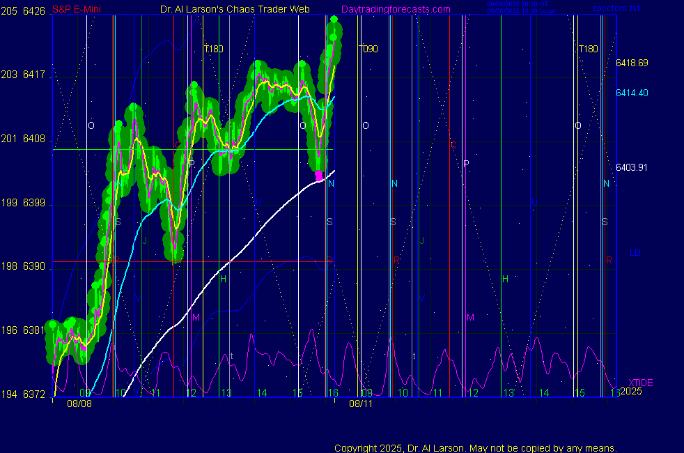 ![]() ![]() as per chart 3 on SPKISS page 09:54 440, 220, 110 down; sell 6381 carried through 13:18 ; stopped 6345 for +36 Tomorrow: Moon conjoin Pluto, oppose Mercury **************************************************************************** during these volatile times, the point values in these instructions should multiplied by 5 ***************************************************************************** For trade times before 11:00, be sure to use EXMA's that include data from 8:15 Eastern Normal Rules ( as published on daytrading forecasts.com in the tutorial): These fit a Trend or Trend continuation scenario, identified by prices trading within a couple of points of the 110 minute EXMA, taking profits on a 12 point range. 1. Watch for the opportunity to go with the trend or change in trend at the time(s) given. Be alert for the turn coming early or late. Be patient and use the tracking indicators. Plan to trade in the direction of the 110 EXMA coming out of that time frame. Prices should stay on one side of the 110 EXMA and it should be moving, or curl up or down from a flat position. Prices should be within about 2 points of the 110 EXMA. The 20 minute EXMA should have crossed the 110 EXMA, or moved toward it and then pulled away from it. When this setup is clear, enter in the direction of the 110 EXMA with a 3 point stop. *** in volatile markets this may need to be 6 points If each setup is not clear 60 minutes after the given time, skip the trade. 2. Move the stop 1 point each 30 minutes. If the market moves decently, trail it by 3 points ( 6 points in volatile markets). 3. Cover on a 5 point gain**, 90 minutes after entry , at the next Tide turn , or if the prices clearly recross the 110 minute EXMA. ********************************************************************** **FAST MOVE RULE If the trade gains 3 points within 30 minutes of entry, press the stop, using the 20 EXMA as a guide to move the stop to the low or high of each pullback (normally about 15 minutes long) once the move makes a new high or low. Cover any gain of 9* points. *It is OK to use the fast stop rule if a trade starts fast, but to then cover at +5 or +4 if it slows or stalls *** Stall rule: Cover any trade that stalls for more than 45 minutes *** Carry through rule If you are in a trade that is working well, if is OK to carry through the next Tide turn *** GO BIG rule: if morning is a big move (>12 points ), and midday is a congestion or pullback, and the last trade of the day sets up near 2:00, a move greater than 9 points may be captured using the technique illustrated at http://moneytide.com/hans/cc09092008.asp *** VOLATILE MARKET RULE -use with discretion in volatile markets, the 55 minute EXMA used in place of the 110 minute EXMA may provide an earlier and lower risk entry. This is most useful when the market is extremely oversold or overbought and reversing, or during a fast move with minimal dips and one is looking to join the move. |