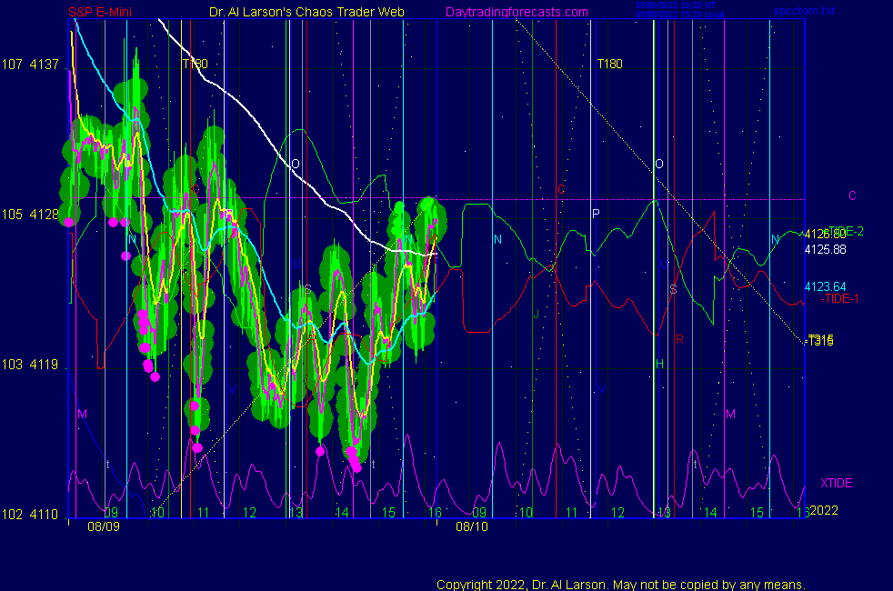 ___________________________________________________________________ charges for this hotline show up on your statement under MicroMedia that's the name of my business, owner of daytradingforecasts.com ___________________________________________________________________ Don't be intimidated by all the complexity of the astro stuff. Our approach is simple. Watch a simple chart, like SP1Day or SPKISS- with 3 minute bars, 20 minute (6 or 7 bars) EXMA, and 110 minute (36 bar) EXMA. Look at the trade times in the Strategy section below. When within about 45 minutes of the trade times, follow the rules given in the Standing Instructions. Keep it simple. Be patient. It works over time. Read the Trading the MoonTides Tutorial and Keep It Simple on the List of Charts page. Also read Finer Timing of the MoonTides, and Trading The MoonTide Rainbow. Check the upcoming Economic reports daily. They are linked on the left side of the ListOfCharts page under Economic News all times given are Eastern Ninja Traders: if your are a paying customer, you will see a link on top right side of ListOfCharts page to download the MoonTide indicator ******************************************************************* This is a very Chaotic market where the normal stops and targets will not work. But the EXMAs still do. They are good guides for stops. Targets 3 to 5 times normal are advised. Also, the 3 minute , 1 or 2 day charts may not show you all you need to know, so keep an eye on longer term charts, at least an hourly covering 4 weeks. !!! *********************************************** ********************* Today: by rule: 10:07 going into trade time 110,220,440 up 20/110 buy 4172 stopped for +4 13:27 440, 220, 110 down 20/110 sell 4146 carried through 14:27 stopped 4139 for +7 Tomorrow: Moon square Chiron **************************************************************************** during these volatile times, the point values in these instructions should multiplied by 5 ***************************************************************************** For trade times before 11:00, be sure to use EXMA's that include data from 8:15 Eastern Normal Rules ( as published on daytrading forecasts.com in the tutorial): These fit a Trend or Trend continuation scenario, identified by prices trading within a couple of points of the 110 minute EXMA, taking profits on a 12 point range. 1. Watch for the opportunity to go with the trend or change in trend at the time(s) given. Be alert for the turn coming early or late. Be patient and use the tracking indicators. Plan to trade in the direction of the 110 EXMA coming out of that time frame. Prices should stay on one side of the 110 EXMA and it should be moving, or curl up or down from a flat position. Prices should be within about 2 points of the 110 EXMA. The 20 minute EXMA should have crossed the 110 EXMA, or moved toward it and then pulled away from it. When this setup is clear, enter in the direction of the 110 EXMA with a 3 point stop. *** in volatile markets this may need to be 6 points If each setup is not clear 60 minutes after the given time, skip the trade. 2. Move the stop 1 point each 30 minutes. If the market moves decently, trail it by 3 points ( 6 points in volatile markets). 3. Cover on a 5 point gain**, 90 minutes after entry , at the next Tide turn , or if the prices clearly recross the 110 minute EXMA. ********************************************************************** **FAST MOVE RULE If the trade gains 3 points within 30 minutes of entry, press the stop, using the 20 EXMA as a guide to move the stop to the low or high of each pullback (normally about 15 minutes long) once the move makes a new high or low. Cover any gain of 9* points. *It is OK to use the fast stop rule if a trade starts fast, but to then cover at +5 or +4 if it slows or stalls *** Stall rule: Cover any trade that stalls for more than 45 minutes *** Carry through rule If you are in a trade that is working well, if is OK to carry through the next Tide turn *** GO BIG rule: if morning is a big move (>12 points ), and midday is a congestion or pullback, and the last trade of the day sets up near 2:00, a move greater than 9 points may be captured using the technique illustrated at http://moneytide.com/hans/cc09092008.asp *** VOLATILE MARKET RULE -use with discretion in volatile markets, the 55 minute EXMA used in place of the 110 minute EXMA may provide an earlier and lower risk entry. This is most useful when the market is extremely oversold or overbought and reversing, or during a fast move with minimal dips and one is looking to join the move. |