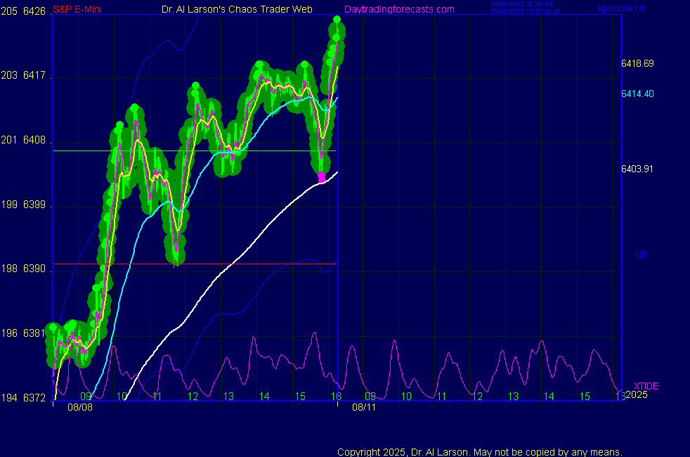 ![]() ![]() as per the Chaos Clinic +25 Tomorrow: Moon conjoin Node **************************************************************************** during these volatile times, the point values in these instructions should multiplied by 5 ***************************************************************************** For trade times before 11:00, be sure to use EXMA's that include data from 8:15 Eastern Normal Rules ( as published on daytrading forecasts.com in the tutorial): These fit a Trend or Trend continuation scenario, identified by prices trading within a couple of points of the 110 minute EXMA, taking profits on a 12 point range. 1. Watch for the opportunity to go with the trend or change in trend at the time(s) given. Be alert for the turn coming early or late. Be patient and use the tracking indicators. Plan to trade in the direction of the 110 EXMA coming out of that time frame. Prices should stay on one side of the 110 EXMA and it should be moving, or curl up or down from a flat position. Prices should be within about 2 points of the 110 EXMA. The 20 minute EXMA should have crossed the 110 EXMA, or moved toward it and then pulled away from it. When this setup is clear, enter in the direction of the 110 EXMA with a 3 point stop. *** in volatile markets this may need to be 6 points If each setup is not clear 60 minutes after the given time, skip the trade. 2. Move the stop 1 point each 30 minutes. If the market moves decently, trail it by 3 points ( 6 points in volatile markets). 3. Cover on a 5 point gain**, 90 minutes after entry , at the next Tide turn , or if the prices clearly recross the 110 minute EXMA. ********************************************************************** **FAST MOVE RULE If the trade gains 3 points within 30 minutes of entry, press the stop, using the 20 EXMA as a guide to move the stop to the low or high of each pullback (normally about 15 minutes long) once the move makes a new high or low. Cover any gain of 9* points. *It is OK to use the fast stop rule if a trade starts fast, but to then cover at +5 or +4 if it slows or stalls *** Stall rule: Cover any trade that stalls for more than 45 minutes *** Carry through rule If you are in a trade that is working well, if is OK to carry through the next Tide turn *** GO BIG rule: if morning is a big move (>12 points ), and midday is a congestion or pullback, and the last trade of the day sets up near 2:00, a move greater than 9 points may be captured using the technique illustrated at http://moneytide.com/hans/cc09092008.asp *** VOLATILE MARKET RULE -use with discretion in volatile markets, the 55 minute EXMA used in place of the 110 minute EXMA may provide an earlier and lower risk entry. This is most useful when the market is extremely oversold or overbought and reversing, or during a fast move with minimal dips and one is looking to join the move. |