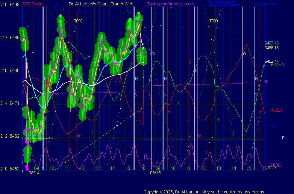 ![]() ![]() as per chart 3 on SPKISS page 11:59 440, 220, 110 up; buy 6450 carried through 14:43-covered for +15 Tomorrow: Moon square Venus/Jupiter **************************************************************************** during these volatile times, the point values in these instructions should multiplied by 5 ***************************************************************************** For trade times before 11:00, be sure to use EXMA's that include data from 8:15 Eastern Normal Rules ( as published on daytrading forecasts.com in the tutorial): These fit a Trend or Trend continuation scenario, identified by prices trading within a couple of points of the 110 minute EXMA, taking profits on a 12 point range. 1. Watch for the opportunity to go with the trend or change in trend at the time(s) given. Be alert for the turn coming early or late. Be patient and use the tracking indicators. Plan to trade in the direction of the 110 EXMA coming out of that time frame. Prices should stay on one side of the 110 EXMA and it should be moving, or curl up or down from a flat position. Prices should be within about 2 points of the 110 EXMA. The 20 minute EXMA should have crossed the 110 EXMA, or moved toward it and then pulled away from it. When this setup is clear, enter in the direction of the 110 EXMA with a 3 point stop. *** in volatile markets this may need to be 6 points If each setup is not clear 60 minutes after the given time, skip the trade. 2. Move the stop 1 point each 30 minutes. If the market moves decently, trail it by 3 points ( 6 points in volatile markets). 3. Cover on a 5 point gain**, 90 minutes after entry , at the next Tide turn , or if the prices clearly recross the 110 minute EXMA. ********************************************************************** **FAST MOVE RULE If the trade gains 3 points within 30 minutes of entry, press the stop, using the 20 EXMA as a guide to move the stop to the low or high of each pullback (normally about 15 minutes long) once the move makes a new high or low. Cover any gain of 9* points. *It is OK to use the fast stop rule if a trade starts fast, but to then cover at +5 or +4 if it slows or stalls *** Stall rule: Cover any trade that stalls for more than 45 minutes *** Carry through rule If you are in a trade that is working well, if is OK to carry through the next Tide turn *** GO BIG rule: if morning is a big move (>12 points ), and midday is a congestion or pullback, and the last trade of the day sets up near 2:00, a move greater than 9 points may be captured using the technique illustrated at http://moneytide.com/hans/cc09092008.asp *** VOLATILE MARKET RULE -use with discretion in volatile markets, the 55 minute EXMA used in place of the 110 minute EXMA may provide an earlier and lower risk entry. This is most useful when the market is extremely oversold or overbought and reversing, or during a fast move with minimal dips and one is looking to join the move. |