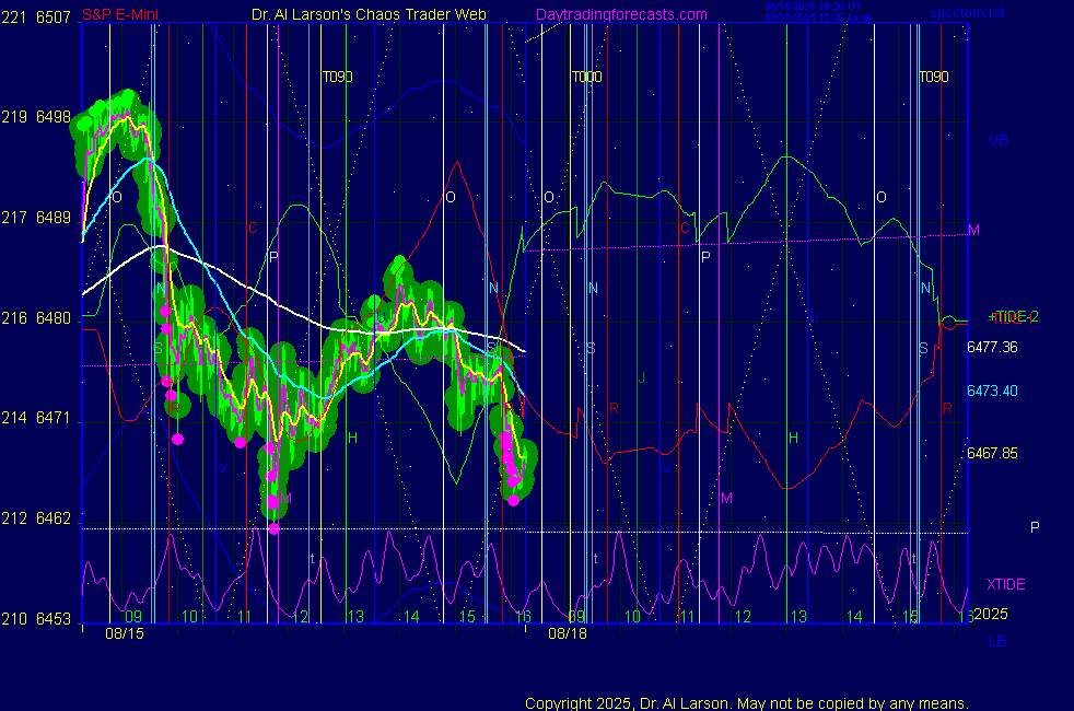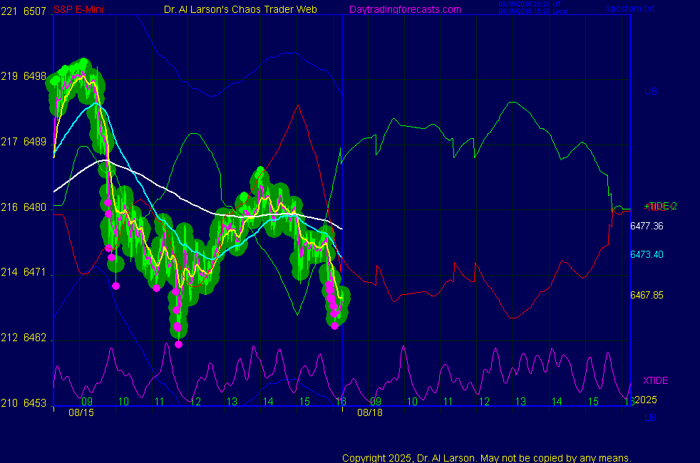 ![]() ![]() as per chart 3 on SPKISS page 10:03 440, 220, 110 up; buy 6478, stopped for +9 11:17 440, 220, 110 down; sell 6473, stopped for -2 14:45 440, 220, 110 up; buy 6486, stopped for +5 Tomorrow: Moon square Sun **************************************************************************** during these volatile times, the point values in these instructions should multiplied by 5 ***************************************************************************** For trade times before 11:00, be sure to use EXMA's that include data from 8:15 Eastern Normal Rules ( as published on daytrading forecasts.com in the tutorial): These fit a Trend or Trend continuation scenario, identified by prices trading within a couple of points of the 110 minute EXMA, taking profits on a 12 point range. 1. Watch for the opportunity to go with the trend or change in trend at the time(s) given. Be alert for the turn coming early or late. Be patient and use the tracking indicators. Plan to trade in the direction of the 110 EXMA coming out of that time frame. Prices should stay on one side of the 110 EXMA and it should be moving, or curl up or down from a flat position. Prices should be within about 2 points of the 110 EXMA. The 20 minute EXMA should have crossed the 110 EXMA, or moved toward it and then pulled away from it. When this setup is clear, enter in the direction of the 110 EXMA with a 3 point stop. *** in volatile markets this may need to be 6 points If each setup is not clear 60 minutes after the given time, skip the trade. 2. Move the stop 1 point each 30 minutes. If the market moves decently, trail it by 3 points ( 6 points in volatile markets). 3. Cover on a 5 point gain**, 90 minutes after entry , at the next Tide turn , or if the prices clearly recross the 110 minute EXMA. ********************************************************************** **FAST MOVE RULE If the trade gains 3 points within 30 minutes of entry, press the stop, using the 20 EXMA as a guide to move the stop to the low or high of each pullback (normally about 15 minutes long) once the move makes a new high or low. Cover any gain of 9* points. *It is OK to use the fast stop rule if a trade starts fast, but to then cover at +5 or +4 if it slows or stalls *** Stall rule: Cover any trade that stalls for more than 45 minutes *** Carry through rule If you are in a trade that is working well, if is OK to carry through the next Tide turn *** GO BIG rule: if morning is a big move (>12 points ), and midday is a congestion or pullback, and the last trade of the day sets up near 2:00, a move greater than 9 points may be captured using the technique illustrated at http://moneytide.com/hans/cc09092008.asp *** VOLATILE MARKET RULE -use with discretion in volatile markets, the 55 minute EXMA used in place of the 110 minute EXMA may provide an earlier and lower risk entry. This is most useful when the market is extremely oversold or overbought and reversing, or during a fast move with minimal dips and one is looking to join the move. |