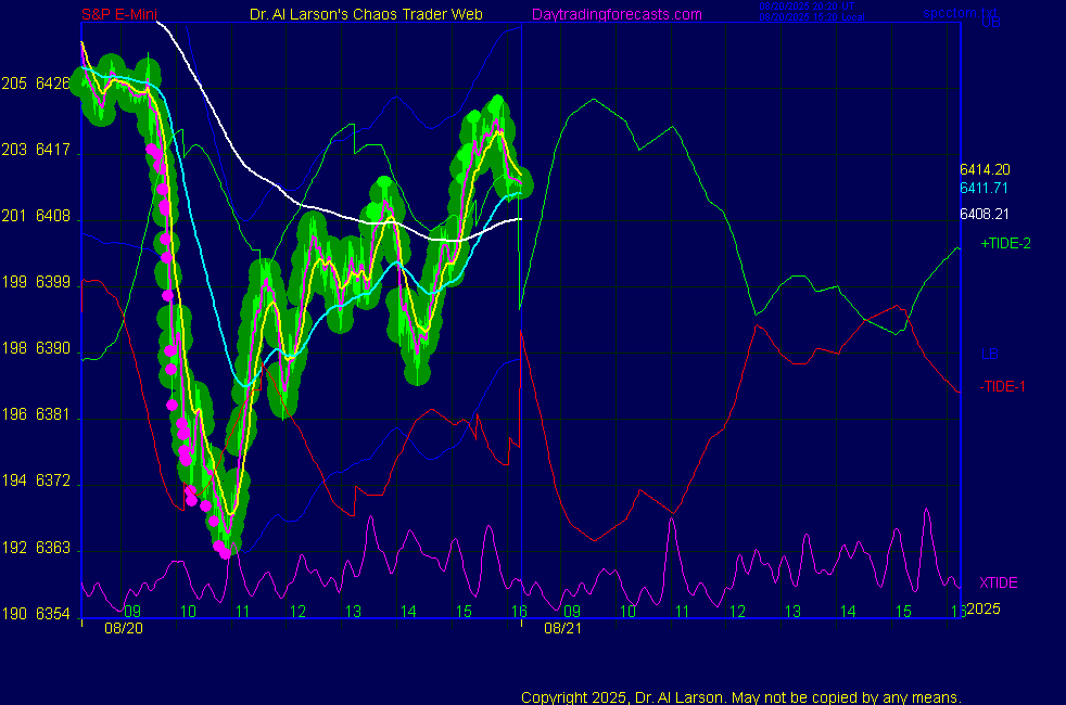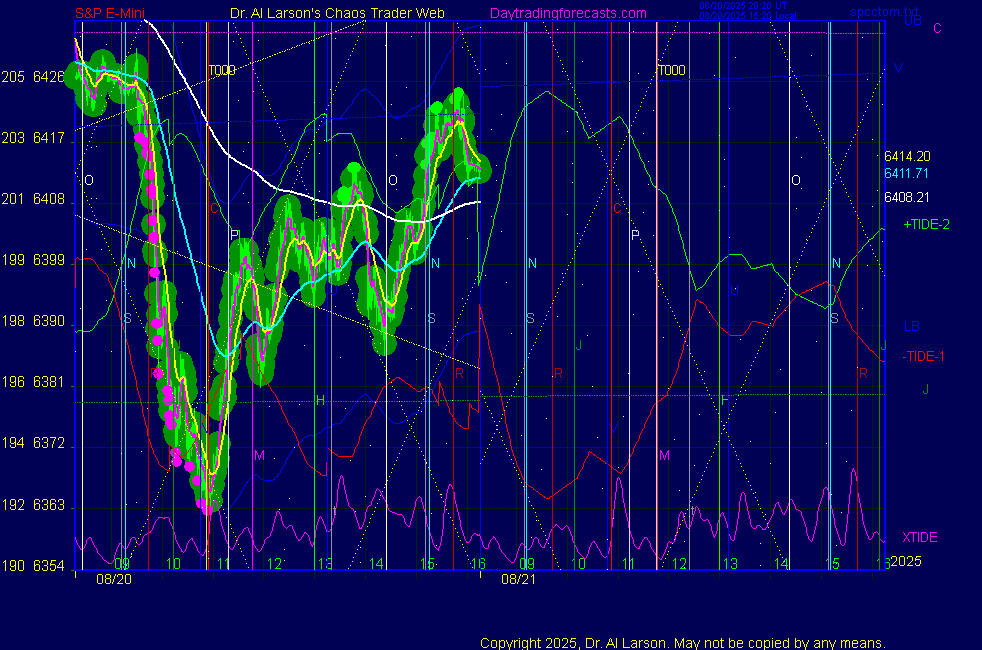 ![]() ![]() Today: 10:41 sold 6466 stopped +16 14:09 sold 6429 stopped -2 Tomorrow: Moon conjoin Venus, opposed Pluto, square Chiron **************************************************************************** during these volatile times, the point values in these instructions should multiplied by 5 ***************************************************************************** For trade times before 11:00, be sure to use EXMA's that include data from 8:15 Eastern Normal Rules ( as published on daytrading forecasts.com in the tutorial): These fit a Trend or Trend continuation scenario, identified by prices trading within a couple of points of the 110 minute EXMA, taking profits on a 12 point range. 1. Watch for the opportunity to go with the trend or change in trend at the time(s) given. Be alert for the turn coming early or late. Be patient and use the tracking indicators. Plan to trade in the direction of the 110 EXMA coming out of that time frame. Prices should stay on one side of the 110 EXMA and it should be moving, or curl up or down from a flat position. Prices should be within about 2 points of the 110 EXMA. The 20 minute EXMA should have crossed the 110 EXMA, or moved toward it and then pulled away from it. When this setup is clear, enter in the direction of the 110 EXMA with a 3 point stop. *** in volatile markets this may need to be 6 points If each setup is not clear 60 minutes after the given time, skip the trade. 2. Move the stop 1 point each 30 minutes. If the market moves decently, trail it by 3 points ( 6 points in volatile markets). 3. Cover on a 5 point gain**, 90 minutes after entry , at the next Tide turn , or if the prices clearly recross the 110 minute EXMA. ********************************************************************** **FAST MOVE RULE If the trade gains 3 points within 30 minutes of entry, press the stop, using the 20 EXMA as a guide to move the stop to the low or high of each pullback (normally about 15 minutes long) once the move makes a new high or low. Cover any gain of 9* points. *It is OK to use the fast stop rule if a trade starts fast, but to then cover at +5 or +4 if it slows or stalls *** Stall rule: Cover any trade that stalls for more than 45 minutes *** Carry through rule If you are in a trade that is working well, if is OK to carry through the next Tide turn *** GO BIG rule: if morning is a big move (>12 points ), and midday is a congestion or pullback, and the last trade of the day sets up near 2:00, a move greater than 9 points may be captured using the technique illustrated at http://moneytide.com/hans/cc09092008.asp *** VOLATILE MARKET RULE -use with discretion in volatile markets, the 55 minute EXMA used in place of the 110 minute EXMA may provide an earlier and lower risk entry. This is most useful when the market is extremely oversold or overbought and reversing, or during a fast move with minimal dips and one is looking to join the move. |