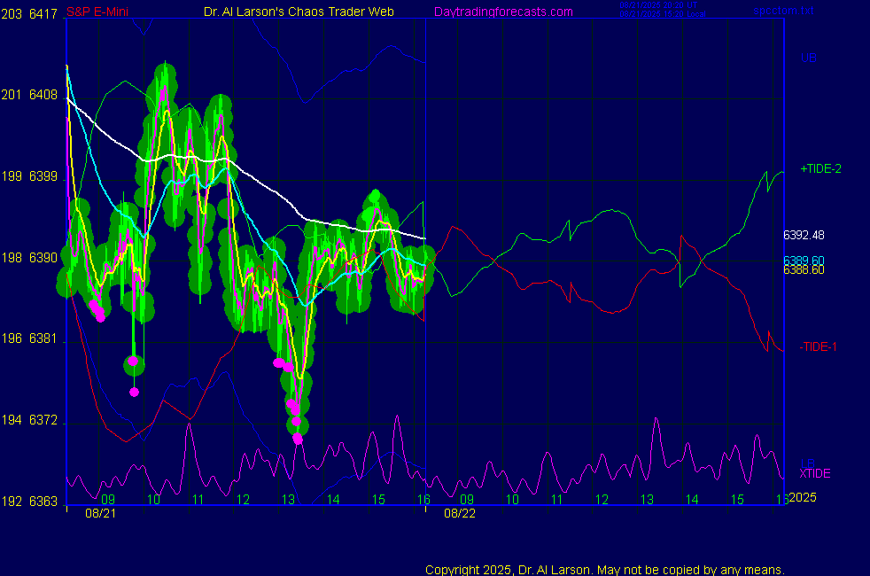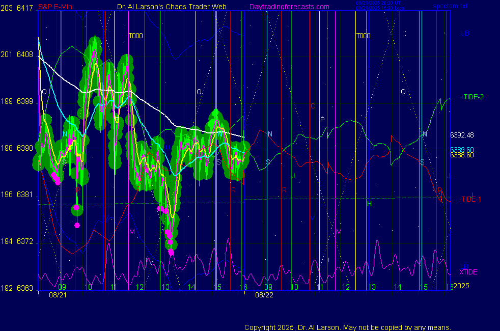 ![]() ![]() Today: 10:08 sold 6420 covered for +18 13:12 bought 6406 stopped for -4 Tomorrow: Moon conjoin Mercury **************************************************************************** during these volatile times, the point values in these instructions should multiplied by 5 ***************************************************************************** For trade times before 11:00, be sure to use EXMA's that include data from 8:15 Eastern Normal Rules ( as published on daytrading forecasts.com in the tutorial): These fit a Trend or Trend continuation scenario, identified by prices trading within a couple of points of the 110 minute EXMA, taking profits on a 12 point range. 1. Watch for the opportunity to go with the trend or change in trend at the time(s) given. Be alert for the turn coming early or late. Be patient and use the tracking indicators. Plan to trade in the direction of the 110 EXMA coming out of that time frame. Prices should stay on one side of the 110 EXMA and it should be moving, or curl up or down from a flat position. Prices should be within about 2 points of the 110 EXMA. The 20 minute EXMA should have crossed the 110 EXMA, or moved toward it and then pulled away from it. When this setup is clear, enter in the direction of the 110 EXMA with a 3 point stop. *** in volatile markets this may need to be 6 points If each setup is not clear 60 minutes after the given time, skip the trade. 2. Move the stop 1 point each 30 minutes. If the market moves decently, trail it by 3 points ( 6 points in volatile markets). 3. Cover on a 5 point gain**, 90 minutes after entry , at the next Tide turn , or if the prices clearly recross the 110 minute EXMA. ********************************************************************** **FAST MOVE RULE If the trade gains 3 points within 30 minutes of entry, press the stop, using the 20 EXMA as a guide to move the stop to the low or high of each pullback (normally about 15 minutes long) once the move makes a new high or low. Cover any gain of 9* points. *It is OK to use the fast stop rule if a trade starts fast, but to then cover at +5 or +4 if it slows or stalls *** Stall rule: Cover any trade that stalls for more than 45 minutes *** Carry through rule If you are in a trade that is working well, if is OK to carry through the next Tide turn *** GO BIG rule: if morning is a big move (>12 points ), and midday is a congestion or pullback, and the last trade of the day sets up near 2:00, a move greater than 9 points may be captured using the technique illustrated at http://moneytide.com/hans/cc09092008.asp *** VOLATILE MARKET RULE -use with discretion in volatile markets, the 55 minute EXMA used in place of the 110 minute EXMA may provide an earlier and lower risk entry. This is most useful when the market is extremely oversold or overbought and reversing, or during a fast move with minimal dips and one is looking to join the move. |
