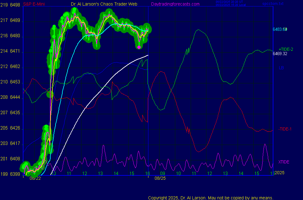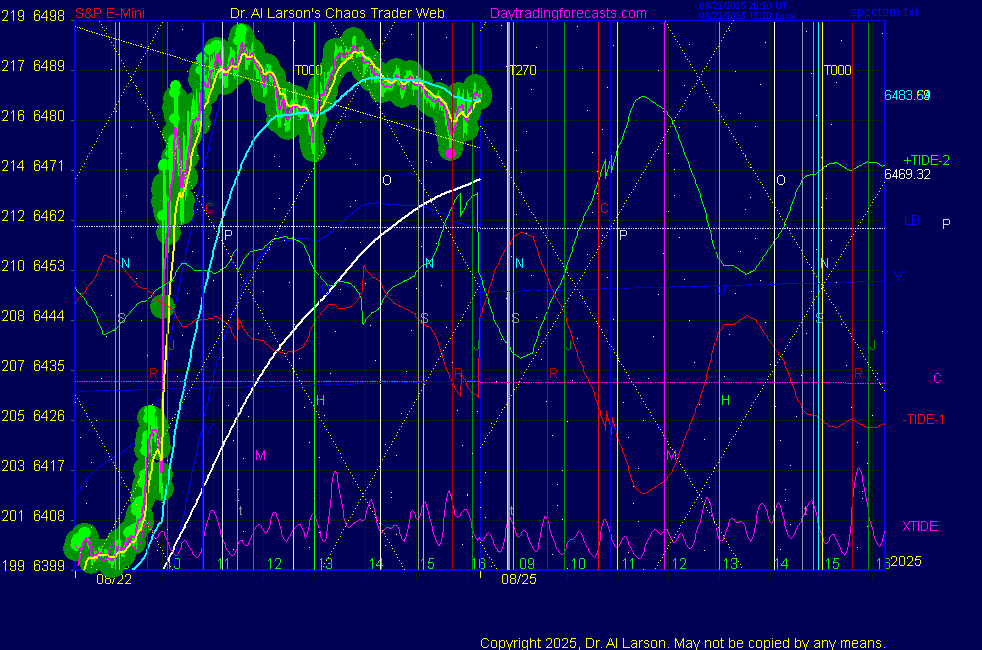 ![]() ![]() Today: 12:35 sold 6387 covered +11 Tomorrow: Moon conjoin Sun, square Uranus **************************************************************************** during these volatile times, the point values in these instructions should multiplied by 5 ***************************************************************************** For trade times before 11:00, be sure to use EXMA's that include data from 8:15 Eastern Normal Rules ( as published on daytrading forecasts.com in the tutorial): These fit a Trend or Trend continuation scenario, identified by prices trading within a couple of points of the 110 minute EXMA, taking profits on a 12 point range. 1. Watch for the opportunity to go with the trend or change in trend at the time(s) given. Be alert for the turn coming early or late. Be patient and use the tracking indicators. Plan to trade in the direction of the 110 EXMA coming out of that time frame. Prices should stay on one side of the 110 EXMA and it should be moving, or curl up or down from a flat position. Prices should be within about 2 points of the 110 EXMA. The 20 minute EXMA should have crossed the 110 EXMA, or moved toward it and then pulled away from it. When this setup is clear, enter in the direction of the 110 EXMA with a 3 point stop. *** in volatile markets this may need to be 6 points If each setup is not clear 60 minutes after the given time, skip the trade. 2. Move the stop 1 point each 30 minutes. If the market moves decently, trail it by 3 points ( 6 points in volatile markets). 3. Cover on a 5 point gain**, 90 minutes after entry , at the next Tide turn , or if the prices clearly recross the 110 minute EXMA. ********************************************************************** **FAST MOVE RULE If the trade gains 3 points within 30 minutes of entry, press the stop, using the 20 EXMA as a guide to move the stop to the low or high of each pullback (normally about 15 minutes long) once the move makes a new high or low. Cover any gain of 9* points. *It is OK to use the fast stop rule if a trade starts fast, but to then cover at +5 or +4 if it slows or stalls *** Stall rule: Cover any trade that stalls for more than 45 minutes *** Carry through rule If you are in a trade that is working well, if is OK to carry through the next Tide turn *** GO BIG rule: if morning is a big move (>12 points ), and midday is a congestion or pullback, and the last trade of the day sets up near 2:00, a move greater than 9 points may be captured using the technique illustrated at http://moneytide.com/hans/cc09092008.asp *** VOLATILE MARKET RULE -use with discretion in volatile markets, the 55 minute EXMA used in place of the 110 minute EXMA may provide an earlier and lower risk entry. This is most useful when the market is extremely oversold or overbought and reversing, or during a fast move with minimal dips and one is looking to join the move. |