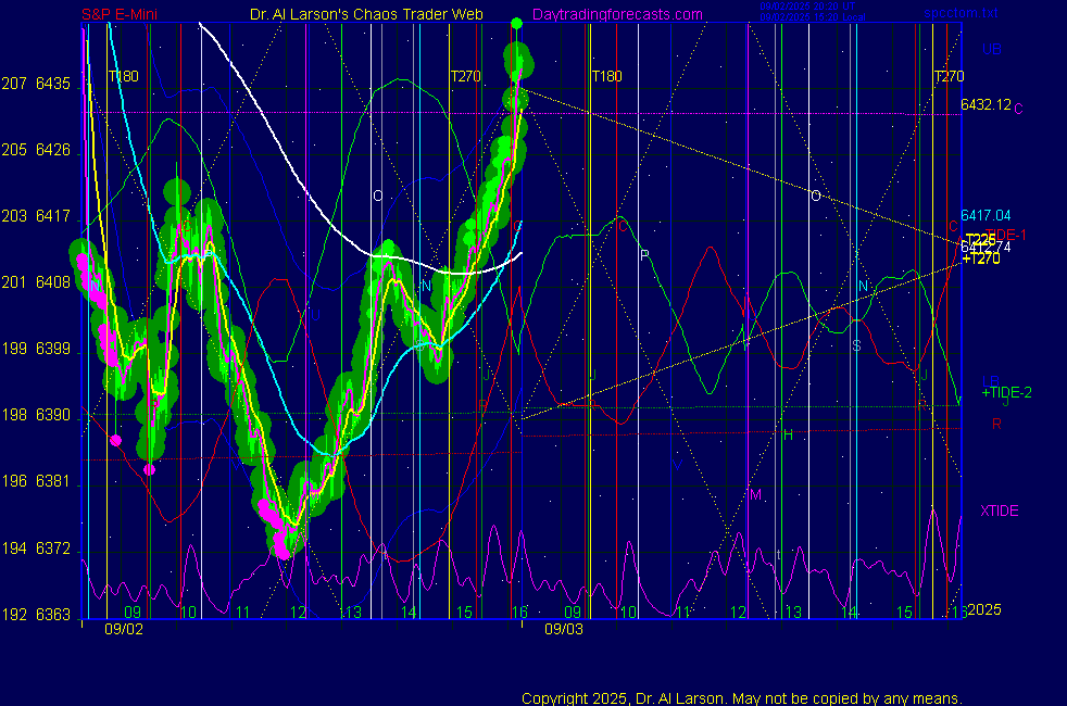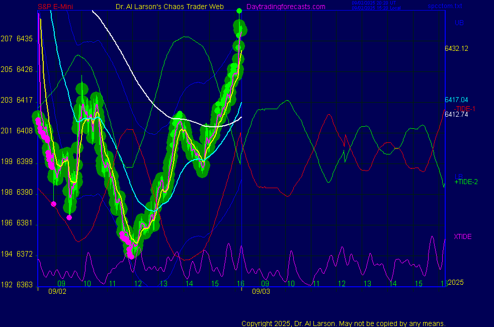 ![]() ![]() Today: as per the Chaos Clinic +30, -4 Tomorrow: Moon applying square of Mars, opposition Jupiter **************************************************************************** during these volatile times, the point values in these instructions should multiplied by 5 ***************************************************************************** For trade times before 11:00, be sure to use EXMA's that include data from 8:15 Eastern Normal Rules ( as published on daytrading forecasts.com in the tutorial): These fit a Trend or Trend continuation scenario, identified by prices trading within a couple of points of the 110 minute EXMA, taking profits on a 12 point range. 1. Watch for the opportunity to go with the trend or change in trend at the time(s) given. Be alert for the turn coming early or late. Be patient and use the tracking indicators. Plan to trade in the direction of the 110 EXMA coming out of that time frame. Prices should stay on one side of the 110 EXMA and it should be moving, or curl up or down from a flat position. Prices should be within about 2 points of the 110 EXMA. The 20 minute EXMA should have crossed the 110 EXMA, or moved toward it and then pulled away from it. When this setup is clear, enter in the direction of the 110 EXMA with a 3 point stop. *** in volatile markets this may need to be 6 points If each setup is not clear 60 minutes after the given time, skip the trade. 2. Move the stop 1 point each 30 minutes. If the market moves decently, trail it by 3 points ( 6 points in volatile markets). 3. Cover on a 5 point gain**, 90 minutes after entry , at the next Tide turn , or if the prices clearly recross the 110 minute EXMA. ********************************************************************** **FAST MOVE RULE If the trade gains 3 points within 30 minutes of entry, press the stop, using the 20 EXMA as a guide to move the stop to the low or high of each pullback (normally about 15 minutes long) once the move makes a new high or low. Cover any gain of 9* points. *It is OK to use the fast stop rule if a trade starts fast, but to then cover at +5 or +4 if it slows or stalls *** Stall rule: Cover any trade that stalls for more than 45 minutes *** Carry through rule If you are in a trade that is working well, if is OK to carry through the next Tide turn *** GO BIG rule: if morning is a big move (>12 points ), and midday is a congestion or pullback, and the last trade of the day sets up near 2:00, a move greater than 9 points may be captured using the technique illustrated at http://moneytide.com/hans/cc09092008.asp *** VOLATILE MARKET RULE -use with discretion in volatile markets, the 55 minute EXMA used in place of the 110 minute EXMA may provide an earlier and lower risk entry. This is most useful when the market is extremely oversold or overbought and reversing, or during a fast move with minimal dips and one is looking to join the move. |
