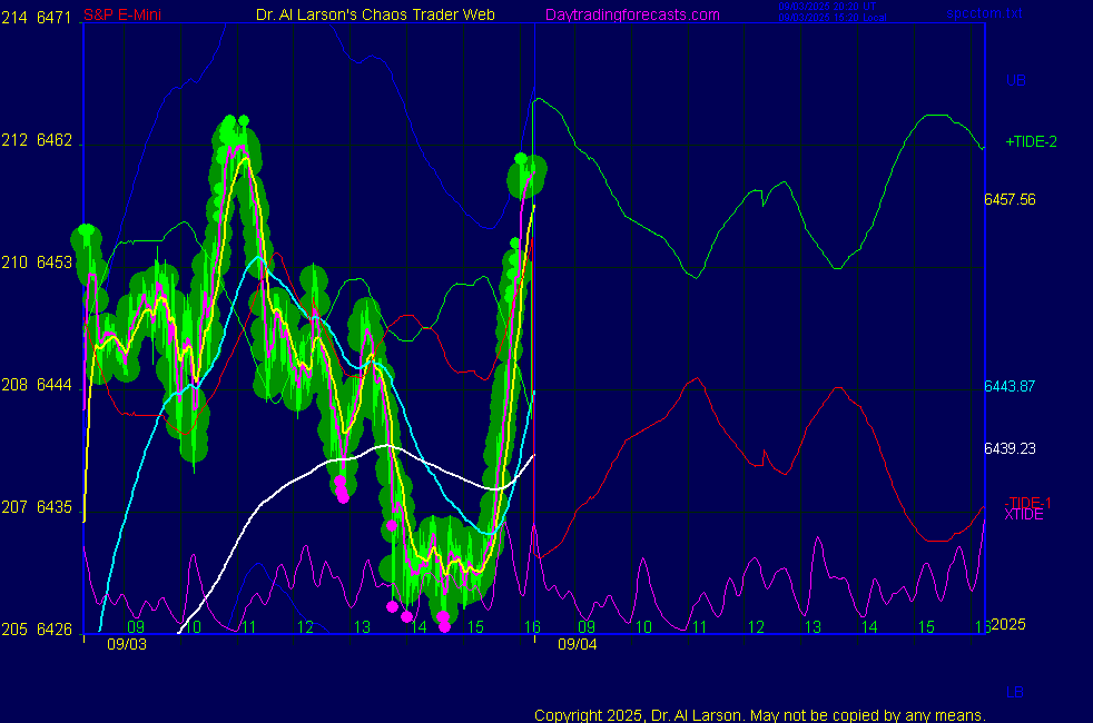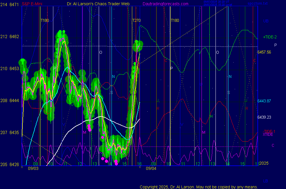 ![]() ![]() Today: as per chart 3 on the SPKISS page 09:54 440, 220, 110 down; sell 6408 stopped 6381 for +27 11:48 440 down, 20 and 110 up-passed 14:02 440, 220,110 turned up; buy 6412 covered near close for +12 Tomorrow: Moon square Mars, oppose Jupiter, square Chiron in T-square **************************************************************************** during these volatile times, the point values in these instructions should multiplied by 5 ***************************************************************************** For trade times before 11:00, be sure to use EXMA's that include data from 8:15 Eastern Normal Rules ( as published on daytrading forecasts.com in the tutorial): These fit a Trend or Trend continuation scenario, identified by prices trading within a couple of points of the 110 minute EXMA, taking profits on a 12 point range. 1. Watch for the opportunity to go with the trend or change in trend at the time(s) given. Be alert for the turn coming early or late. Be patient and use the tracking indicators. Plan to trade in the direction of the 110 EXMA coming out of that time frame. Prices should stay on one side of the 110 EXMA and it should be moving, or curl up or down from a flat position. Prices should be within about 2 points of the 110 EXMA. The 20 minute EXMA should have crossed the 110 EXMA, or moved toward it and then pulled away from it. When this setup is clear, enter in the direction of the 110 EXMA with a 3 point stop. *** in volatile markets this may need to be 6 points If each setup is not clear 60 minutes after the given time, skip the trade. 2. Move the stop 1 point each 30 minutes. If the market moves decently, trail it by 3 points ( 6 points in volatile markets). 3. Cover on a 5 point gain**, 90 minutes after entry , at the next Tide turn , or if the prices clearly recross the 110 minute EXMA. ********************************************************************** **FAST MOVE RULE If the trade gains 3 points within 30 minutes of entry, press the stop, using the 20 EXMA as a guide to move the stop to the low or high of each pullback (normally about 15 minutes long) once the move makes a new high or low. Cover any gain of 9* points. *It is OK to use the fast stop rule if a trade starts fast, but to then cover at +5 or +4 if it slows or stalls *** Stall rule: Cover any trade that stalls for more than 45 minutes *** Carry through rule If you are in a trade that is working well, if is OK to carry through the next Tide turn *** GO BIG rule: if morning is a big move (>12 points ), and midday is a congestion or pullback, and the last trade of the day sets up near 2:00, a move greater than 9 points may be captured using the technique illustrated at http://moneytide.com/hans/cc09092008.asp *** VOLATILE MARKET RULE -use with discretion in volatile markets, the 55 minute EXMA used in place of the 110 minute EXMA may provide an earlier and lower risk entry. This is most useful when the market is extremely oversold or overbought and reversing, or during a fast move with minimal dips and one is looking to join the move. |