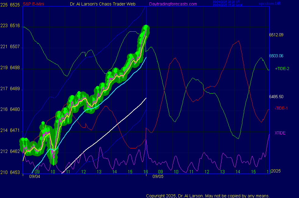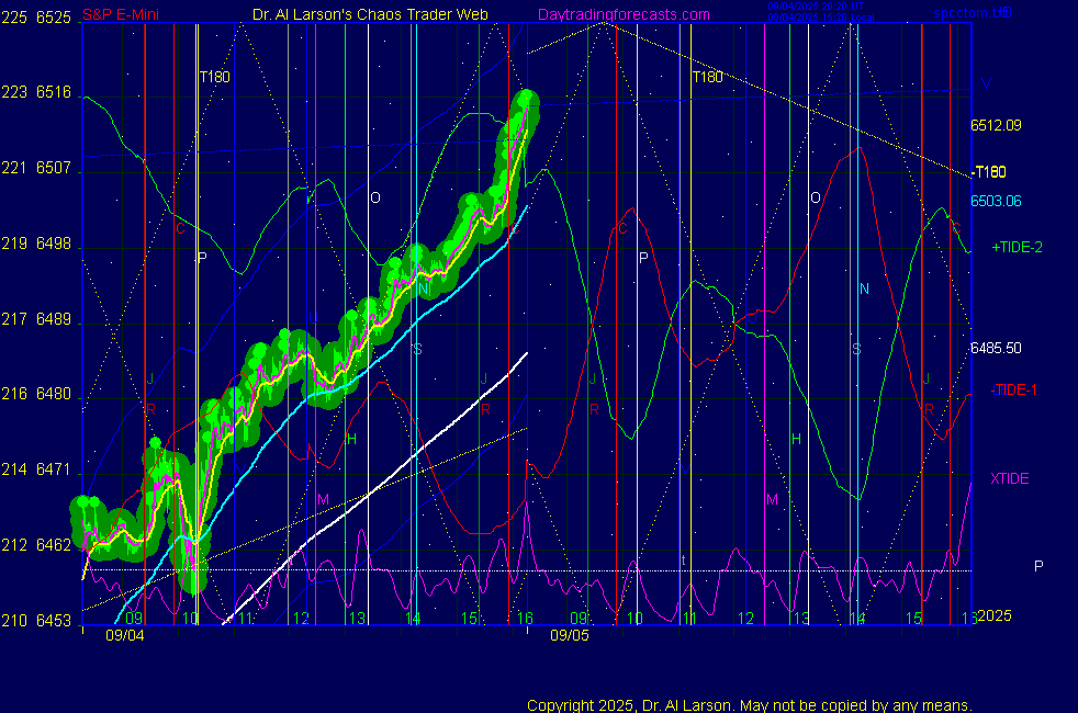 ![]() ![]() Today: as per chart 3 on the SPKISS page 10:07 440, 220, 110 up; buy 6452 stopped for +4 13:13 440, 220, 110 down; sell 6440 covered on stall 6431 for +9 Tomorrow: Moon conjoin Pluto, oppose Venus, square Chiron **************************************************************************** during these volatile times, the point values in these instructions should multiplied by 5 ***************************************************************************** For trade times before 11:00, be sure to use EXMA's that include data from 8:15 Eastern Normal Rules ( as published on daytrading forecasts.com in the tutorial): These fit a Trend or Trend continuation scenario, identified by prices trading within a couple of points of the 110 minute EXMA, taking profits on a 12 point range. 1. Watch for the opportunity to go with the trend or change in trend at the time(s) given. Be alert for the turn coming early or late. Be patient and use the tracking indicators. Plan to trade in the direction of the 110 EXMA coming out of that time frame. Prices should stay on one side of the 110 EXMA and it should be moving, or curl up or down from a flat position. Prices should be within about 2 points of the 110 EXMA. The 20 minute EXMA should have crossed the 110 EXMA, or moved toward it and then pulled away from it. When this setup is clear, enter in the direction of the 110 EXMA with a 3 point stop. *** in volatile markets this may need to be 6 points If each setup is not clear 60 minutes after the given time, skip the trade. 2. Move the stop 1 point each 30 minutes. If the market moves decently, trail it by 3 points ( 6 points in volatile markets). 3. Cover on a 5 point gain**, 90 minutes after entry , at the next Tide turn , or if the prices clearly recross the 110 minute EXMA. ********************************************************************** **FAST MOVE RULE If the trade gains 3 points within 30 minutes of entry, press the stop, using the 20 EXMA as a guide to move the stop to the low or high of each pullback (normally about 15 minutes long) once the move makes a new high or low. Cover any gain of 9* points. *It is OK to use the fast stop rule if a trade starts fast, but to then cover at +5 or +4 if it slows or stalls *** Stall rule: Cover any trade that stalls for more than 45 minutes *** Carry through rule If you are in a trade that is working well, if is OK to carry through the next Tide turn *** GO BIG rule: if morning is a big move (>12 points ), and midday is a congestion or pullback, and the last trade of the day sets up near 2:00, a move greater than 9 points may be captured using the technique illustrated at http://moneytide.com/hans/cc09092008.asp *** VOLATILE MARKET RULE -use with discretion in volatile markets, the 55 minute EXMA used in place of the 110 minute EXMA may provide an earlier and lower risk entry. This is most useful when the market is extremely oversold or overbought and reversing, or during a fast move with minimal dips and one is looking to join the move. |