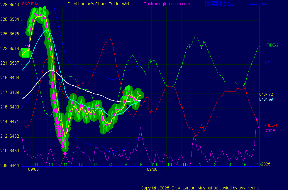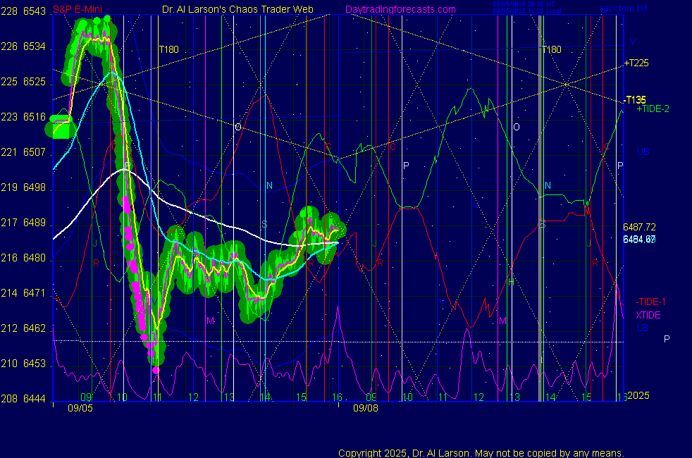 ![]() ![]() Today: as per chart 3 on the SPKISS page 09:31 440, 220, 110 up; buy 6467 carried through 13:43 covered near close 6511 for +44 Tomorrow: Moon oppose Venus **************************************************************************** during these volatile times, the point values in these instructions should multiplied by 5 ***************************************************************************** For trade times before 11:00, be sure to use EXMA's that include data from 8:15 Eastern Normal Rules ( as published on daytrading forecasts.com in the tutorial): These fit a Trend or Trend continuation scenario, identified by prices trading within a couple of points of the 110 minute EXMA, taking profits on a 12 point range. 1. Watch for the opportunity to go with the trend or change in trend at the time(s) given. Be alert for the turn coming early or late. Be patient and use the tracking indicators. Plan to trade in the direction of the 110 EXMA coming out of that time frame. Prices should stay on one side of the 110 EXMA and it should be moving, or curl up or down from a flat position. Prices should be within about 2 points of the 110 EXMA. The 20 minute EXMA should have crossed the 110 EXMA, or moved toward it and then pulled away from it. When this setup is clear, enter in the direction of the 110 EXMA with a 3 point stop. *** in volatile markets this may need to be 6 points If each setup is not clear 60 minutes after the given time, skip the trade. 2. Move the stop 1 point each 30 minutes. If the market moves decently, trail it by 3 points ( 6 points in volatile markets). 3. Cover on a 5 point gain**, 90 minutes after entry , at the next Tide turn , or if the prices clearly recross the 110 minute EXMA. ********************************************************************** **FAST MOVE RULE If the trade gains 3 points within 30 minutes of entry, press the stop, using the 20 EXMA as a guide to move the stop to the low or high of each pullback (normally about 15 minutes long) once the move makes a new high or low. Cover any gain of 9* points. *It is OK to use the fast stop rule if a trade starts fast, but to then cover at +5 or +4 if it slows or stalls *** Stall rule: Cover any trade that stalls for more than 45 minutes *** Carry through rule If you are in a trade that is working well, if is OK to carry through the next Tide turn *** GO BIG rule: if morning is a big move (>12 points ), and midday is a congestion or pullback, and the last trade of the day sets up near 2:00, a move greater than 9 points may be captured using the technique illustrated at http://moneytide.com/hans/cc09092008.asp *** VOLATILE MARKET RULE -use with discretion in volatile markets, the 55 minute EXMA used in place of the 110 minute EXMA may provide an earlier and lower risk entry. This is most useful when the market is extremely oversold or overbought and reversing, or during a fast move with minimal dips and one is looking to join the move. |
