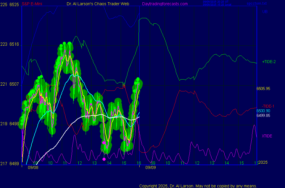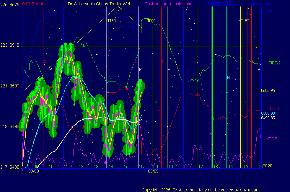 ![]() ![]() Today: as per Chaos Clinic +42 Tomorrow: Moon conjoin Saturn/Neptune **************************************************************************** during these volatile times, the point values in these instructions should multiplied by 5 ***************************************************************************** For trade times before 11:00, be sure to use EXMA's that include data from 8:15 Eastern Normal Rules ( as published on daytrading forecasts.com in the tutorial): These fit a Trend or Trend continuation scenario, identified by prices trading within a couple of points of the 110 minute EXMA, taking profits on a 12 point range. 1. Watch for the opportunity to go with the trend or change in trend at the time(s) given. Be alert for the turn coming early or late. Be patient and use the tracking indicators. Plan to trade in the direction of the 110 EXMA coming out of that time frame. Prices should stay on one side of the 110 EXMA and it should be moving, or curl up or down from a flat position. Prices should be within about 2 points of the 110 EXMA. The 20 minute EXMA should have crossed the 110 EXMA, or moved toward it and then pulled away from it. When this setup is clear, enter in the direction of the 110 EXMA with a 3 point stop. *** in volatile markets this may need to be 6 points If each setup is not clear 60 minutes after the given time, skip the trade. 2. Move the stop 1 point each 30 minutes. If the market moves decently, trail it by 3 points ( 6 points in volatile markets). 3. Cover on a 5 point gain**, 90 minutes after entry , at the next Tide turn , or if the prices clearly recross the 110 minute EXMA. ********************************************************************** **FAST MOVE RULE If the trade gains 3 points within 30 minutes of entry, press the stop, using the 20 EXMA as a guide to move the stop to the low or high of each pullback (normally about 15 minutes long) once the move makes a new high or low. Cover any gain of 9* points. *It is OK to use the fast stop rule if a trade starts fast, but to then cover at +5 or +4 if it slows or stalls *** Stall rule: Cover any trade that stalls for more than 45 minutes *** Carry through rule If you are in a trade that is working well, if is OK to carry through the next Tide turn *** GO BIG rule: if morning is a big move (>12 points ), and midday is a congestion or pullback, and the last trade of the day sets up near 2:00, a move greater than 9 points may be captured using the technique illustrated at http://moneytide.com/hans/cc09092008.asp *** VOLATILE MARKET RULE -use with discretion in volatile markets, the 55 minute EXMA used in place of the 110 minute EXMA may provide an earlier and lower risk entry. This is most useful when the market is extremely oversold or overbought and reversing, or during a fast move with minimal dips and one is looking to join the move. |