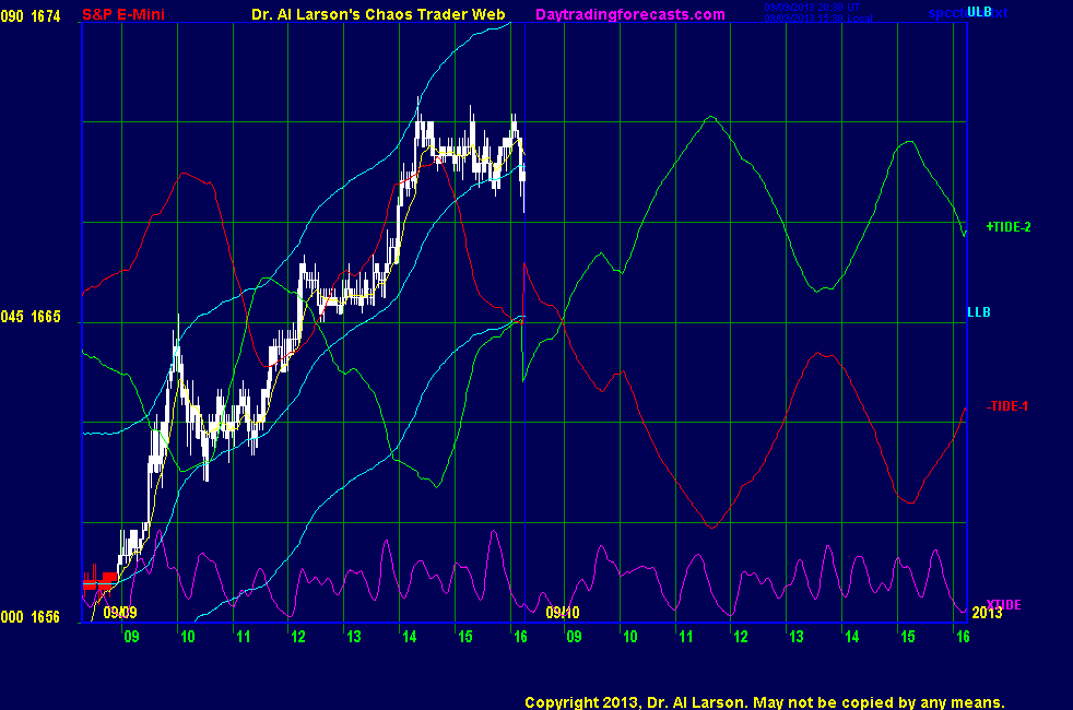 ___________________________________________________________________ Don't be intimidated by all the complexity of the astro stuff. Our approach is simple. Watch a simple chart, like SP1Day or SPKISS- with 3 minute bars, 20 minute (6 or 7 bars) EXMA, and 110 minute (36 bar) EXMA. Look at the trade times in the Strategy section below. When within about ±45 minutes of the trade times, follow the rules given in the Standing Instructions. Keep it simple. Be patient. It works over time. Read the Trading the MoonTides Tutorial and Keep It Simple on the List of Charts page. Also read Finer Timing of the MoonTides, and Trading The MoonTide Rainbow. Check the upcoming Economic reports daily. They are linked on the left side of the ListOfCharts page under Economic News all times given are Eastern Ninja Traders: if your are a paying customer, you will see a link on top right side of ListOfCharts page to download the MoonTide indicator Win2Day Trades: +9,+5,0 as per the Chaos Clinic ********************************* Strategy: (this, a simple chart, and the Standing Instructions are all you really need to trade) be careful about making things up - if there is no juice, don't jump Remember, *********** chaos follows dullness !!!!!!!!!! Tomorrow: Moon conjoin Saturn/Node, square Mars <***> MoonTide Times and Trade Times<***> For trade times before 11:00, be sure to use EXMA's that include data from 8:15 Eastern Normal Rules ( as published on daytrading forecasts.com in the tutorial): These fit a Trend or Trend continuation scenario, identified by prices trading within a couple of points of the 110 minute EXMA, taking profits on a 12 point range. 1. Watch for the opportunity to go with the trend or change in trend at the time(s) given. Be alert for the turn coming early or late. Be patient and use the tracking indicators. Plan to trade in the direction of the 110 EXMA coming out of that time frame. Prices should stay on one side of the 110 EXMA and it should be moving, or curl up or down from a flat position. Prices should be within about 2 points of the 110 EXMA. The 20 minute EXMA should have crossed the 110 EXMA, or moved toward it and then pulled away from it. When this setup is clear, enter in the direction of the 110 EXMA with a 3 point stop. *** in volatile markets this may need to be 6 points If each setup is not clear 60 minutes after the given time, skip the trade. 2. Move the stop 1 point each 30 minutes. If the market moves decently, trail it by 3 points ( 6 points in volatile markets). 3. Cover on a 5 point gain**, 90 minutes after entry , at the next Tide turn , or if the prices clearly recross the 110 minute EXMA. ********************************************************************** **FAST MOVE RULE If the trade gains 3 points within 30 minutes of entry, press the stop, using the 20 EXMA as a guide to move the stop to the low or high of each pullback (normally about 15 minutes long) once the move makes a new high or low. Cover any gain of 9* points. *It is OK to use the fast stop rule if a trade starts fast, but to then cover at +5 or +4 if it slows or stalls *** Stall rule: Cover any trade that stalls for more than 45 minutes *** Carry through rule If you are in a trade that is working well, if is OK to carry through the next Tide turn *** GO BIG rule: if morning is a big move (>12 points ), and midday is a congestion or pullback, and the last trade of the day sets up near 2:00, a move greater than 9 points may be captured using the technique illustrated at http://moneytide.com/hans/cc09092008.asp *** VOLATILE MARKET RULE -use with discretion in volatile markets, the 55 minute EXMA used in place of the 110 minute EXMA may provide an earlier and lower risk entry. This is most useful when the market is extremely oversold or overbought and reversing, or during a fast move with minimal dips and one is looking to join the move. |