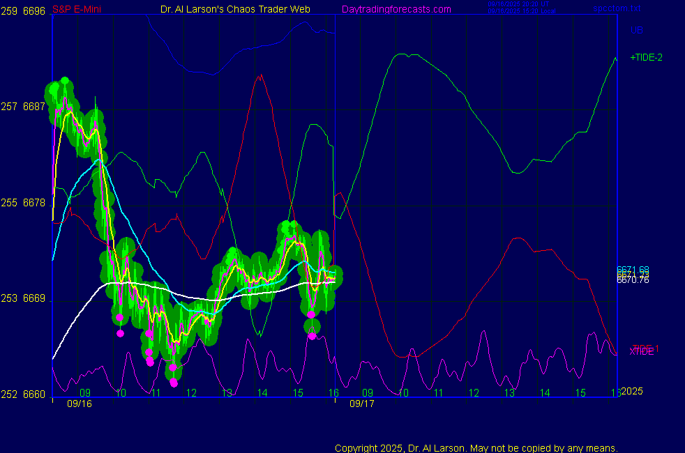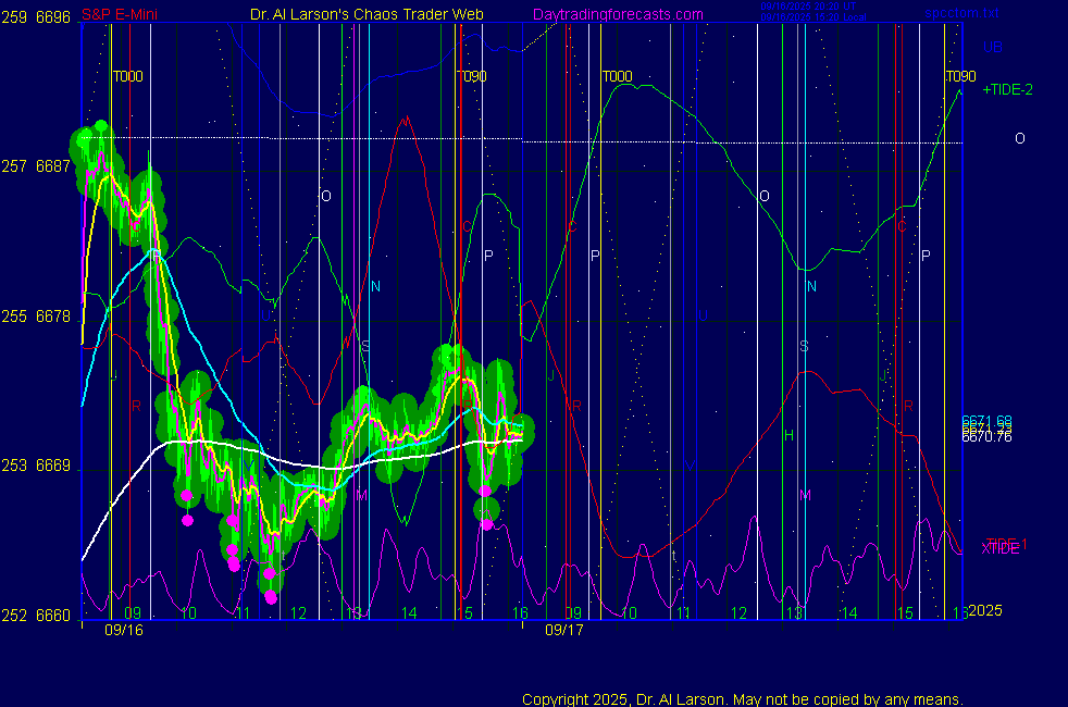 ![]() ![]() Today: as per chart 3 on SPKISS page 09:56 440, 220, 110 up; buy 6675 stopped for +1 13:26 440, 220 up; 110 down -passed 14:55 440 up, 220 and 110 flat-passed Tomorrow: Moon conjoin Jupiter, square Chiron and Mars, oppose Pluto in Grand Cross **************************************************************************** during these volatile times, the point values in these instructions should multiplied by 5 ***************************************************************************** For trade times before 11:00, be sure to use EXMA's that include data from 8:15 Eastern Normal Rules ( as published on daytrading forecasts.com in the tutorial): These fit a Trend or Trend continuation scenario, identified by prices trading within a couple of points of the 110 minute EXMA, taking profits on a 12 point range. 1. Watch for the opportunity to go with the trend or change in trend at the time(s) given. Be alert for the turn coming early or late. Be patient and use the tracking indicators. Plan to trade in the direction of the 110 EXMA coming out of that time frame. Prices should stay on one side of the 110 EXMA and it should be moving, or curl up or down from a flat position. Prices should be within about 2 points of the 110 EXMA. The 20 minute EXMA should have crossed the 110 EXMA, or moved toward it and then pulled away from it. When this setup is clear, enter in the direction of the 110 EXMA with a 3 point stop. *** in volatile markets this may need to be 6 points If each setup is not clear 60 minutes after the given time, skip the trade. 2. Move the stop 1 point each 30 minutes. If the market moves decently, trail it by 3 points ( 6 points in volatile markets). 3. Cover on a 5 point gain**, 90 minutes after entry , at the next Tide turn , or if the prices clearly recross the 110 minute EXMA. ********************************************************************** **FAST MOVE RULE If the trade gains 3 points within 30 minutes of entry, press the stop, using the 20 EXMA as a guide to move the stop to the low or high of each pullback (normally about 15 minutes long) once the move makes a new high or low. Cover any gain of 9* points. *It is OK to use the fast stop rule if a trade starts fast, but to then cover at +5 or +4 if it slows or stalls *** Stall rule: Cover any trade that stalls for more than 45 minutes *** Carry through rule If you are in a trade that is working well, if is OK to carry through the next Tide turn *** GO BIG rule: if morning is a big move (>12 points ), and midday is a congestion or pullback, and the last trade of the day sets up near 2:00, a move greater than 9 points may be captured using the technique illustrated at http://moneytide.com/hans/cc09092008.asp *** VOLATILE MARKET RULE -use with discretion in volatile markets, the 55 minute EXMA used in place of the 110 minute EXMA may provide an earlier and lower risk entry. This is most useful when the market is extremely oversold or overbought and reversing, or during a fast move with minimal dips and one is looking to join the move. |