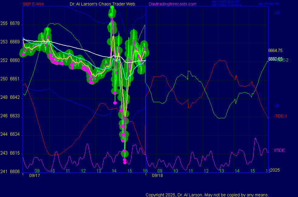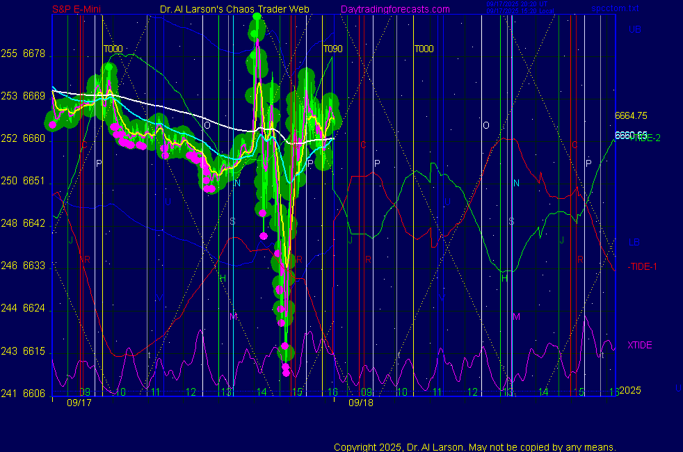 ![]() ![]() Today: as per chart 3 on SPKISS page 12:37 440, 220, 110 up; bought 6670 carried through 14:12 covered on stall for +5 Tomorrow: Moon oppose Pluto, separating square Chiron and Mars in T-square FOMC announcement 2:00, press conference 2:30 widely expected rate cut **************************************************************************** during these volatile times, the point values in these instructions should multiplied by 5 ***************************************************************************** For trade times before 11:00, be sure to use EXMA's that include data from 8:15 Eastern Normal Rules ( as published on daytrading forecasts.com in the tutorial): These fit a Trend or Trend continuation scenario, identified by prices trading within a couple of points of the 110 minute EXMA, taking profits on a 12 point range. 1. Watch for the opportunity to go with the trend or change in trend at the time(s) given. Be alert for the turn coming early or late. Be patient and use the tracking indicators. Plan to trade in the direction of the 110 EXMA coming out of that time frame. Prices should stay on one side of the 110 EXMA and it should be moving, or curl up or down from a flat position. Prices should be within about 2 points of the 110 EXMA. The 20 minute EXMA should have crossed the 110 EXMA, or moved toward it and then pulled away from it. When this setup is clear, enter in the direction of the 110 EXMA with a 3 point stop. *** in volatile markets this may need to be 6 points If each setup is not clear 60 minutes after the given time, skip the trade. 2. Move the stop 1 point each 30 minutes. If the market moves decently, trail it by 3 points ( 6 points in volatile markets). 3. Cover on a 5 point gain**, 90 minutes after entry , at the next Tide turn , or if the prices clearly recross the 110 minute EXMA. ********************************************************************** **FAST MOVE RULE If the trade gains 3 points within 30 minutes of entry, press the stop, using the 20 EXMA as a guide to move the stop to the low or high of each pullback (normally about 15 minutes long) once the move makes a new high or low. Cover any gain of 9* points. *It is OK to use the fast stop rule if a trade starts fast, but to then cover at +5 or +4 if it slows or stalls *** Stall rule: Cover any trade that stalls for more than 45 minutes *** Carry through rule If you are in a trade that is working well, if is OK to carry through the next Tide turn *** GO BIG rule: if morning is a big move (>12 points ), and midday is a congestion or pullback, and the last trade of the day sets up near 2:00, a move greater than 9 points may be captured using the technique illustrated at http://moneytide.com/hans/cc09092008.asp *** VOLATILE MARKET RULE -use with discretion in volatile markets, the 55 minute EXMA used in place of the 110 minute EXMA may provide an earlier and lower risk entry. This is most useful when the market is extremely oversold or overbought and reversing, or during a fast move with minimal dips and one is looking to join the move. |