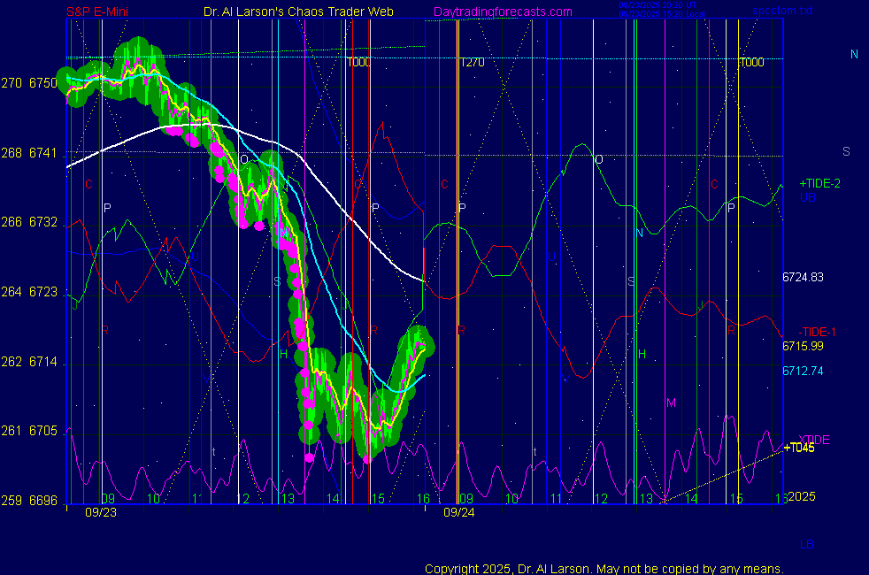 ![]() ![]() Today: as per chart 3 on SPKISS page 10:48 440, 220, 110 up; buy 6722 carried through 12:50 and 14:35 stopped 6750 for +28 Tomorrow: Moon oppose Chiron **************************************************************************** during these volatile times, the point values in these instructions should multiplied by 5 ***************************************************************************** For trade times before 11:00, be sure to use EXMA's that include data from 8:15 Eastern Normal Rules ( as published on daytrading forecasts.com in the tutorial): These fit a Trend or Trend continuation scenario, identified by prices trading within a couple of points of the 110 minute EXMA, taking profits on a 12 point range. 1. Watch for the opportunity to go with the trend or change in trend at the time(s) given. Be alert for the turn coming early or late. Be patient and use the tracking indicators. Plan to trade in the direction of the 110 EXMA coming out of that time frame. Prices should stay on one side of the 110 EXMA and it should be moving, or curl up or down from a flat position. Prices should be within about 2 points of the 110 EXMA. The 20 minute EXMA should have crossed the 110 EXMA, or moved toward it and then pulled away from it. When this setup is clear, enter in the direction of the 110 EXMA with a 3 point stop. *** in volatile markets this may need to be 6 points If each setup is not clear 60 minutes after the given time, skip the trade. 2. Move the stop 1 point each 30 minutes. If the market moves decently, trail it by 3 points ( 6 points in volatile markets). 3. Cover on a 5 point gain**, 90 minutes after entry , at the next Tide turn , or if the prices clearly recross the 110 minute EXMA. ********************************************************************** **FAST MOVE RULE If the trade gains 3 points within 30 minutes of entry, press the stop, using the 20 EXMA as a guide to move the stop to the low or high of each pullback (normally about 15 minutes long) once the move makes a new high or low. Cover any gain of 9* points. *It is OK to use the fast stop rule if a trade starts fast, but to then cover at +5 or +4 if it slows or stalls *** Stall rule: Cover any trade that stalls for more than 45 minutes *** Carry through rule If you are in a trade that is working well, if is OK to carry through the next Tide turn *** GO BIG rule: if morning is a big move (>12 points ), and midday is a congestion or pullback, and the last trade of the day sets up near 2:00, a move greater than 9 points may be captured using the technique illustrated at http://moneytide.com/hans/cc09092008.asp *** VOLATILE MARKET RULE -use with discretion in volatile markets, the 55 minute EXMA used in place of the 110 minute EXMA may provide an earlier and lower risk entry. This is most useful when the market is extremely oversold or overbought and reversing, or during a fast move with minimal dips and one is looking to join the move. |