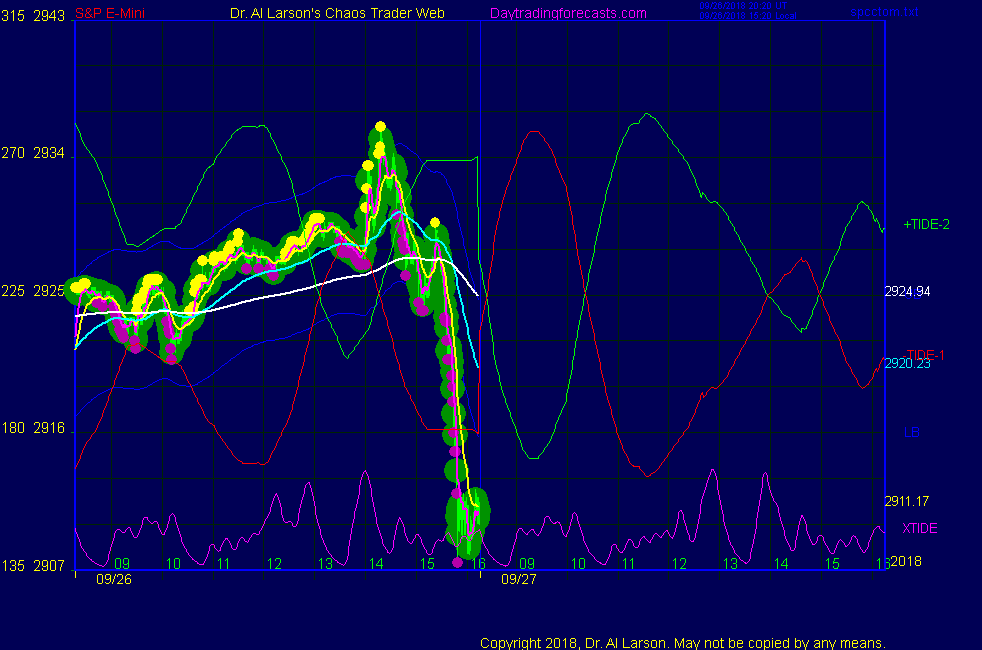 ___________________________________________________________________ Don't be intimidated by all the complexity of the astro stuff. Our approach is simple. Watch a simple chart, like SP1Day or SPKISS- with 3 minute bars, 20 minute (6 or 7 bars) EXMA, and 110 minute (36 bar) EXMA. Look at the trade times in the Strategy section below. When within about 45 minutes of the trade times, follow the rules given in the Standing Instructions. Keep it simple. Be patient. It works over time. Read the Trading the MoonTides Tutorial and Keep It Simple on the List of Charts page. Also read Finer Timing of the MoonTides, and Trading The MoonTide Rainbow. Check the upcoming Economic reports daily. They are linked on the left side of the ListOfCharts page under Economic News all times given are Eastern Ninja Traders: if your are a paying customer, you will see a link on top right side of ListOfCharts page to download the MoonTide indicator ******************************************************************** LOG IN AND CHECK THE AUX PAGE near the close ******************************************************************** Today: by rule 10:22 sold 2927 stopped for +4 12:22 sold 2925 (pivot) covered on stall for +5 14:56 passed - not clear Tomorrow: FOMC meeting ends ; announcement is nearly on Moon T180 timeline! Moon applying conjoin Uranus, square Pluto and Node in T Square <***> MoonTide Times and Trade Times<***> For trade times before 11:00, be sure to use EXMA's that include data from 8:15 Eastern Normal Rules ( as published on daytrading forecasts.com in the tutorial): These fit a Trend or Trend continuation scenario, identified by prices trading within a couple of points of the 110 minute EXMA, taking profits on a 12 point range. 1. Watch for the opportunity to go with the trend or change in trend at the time(s) given. Be alert for the turn coming early or late. Be patient and use the tracking indicators. Plan to trade in the direction of the 110 EXMA coming out of that time frame. Prices should stay on one side of the 110 EXMA and it should be moving, or curl up or down from a flat position. Prices should be within about 2 points of the 110 EXMA. The 20 minute EXMA should have crossed the 110 EXMA, or moved toward it and then pulled away from it. When this setup is clear, enter in the direction of the 110 EXMA with a 3 point stop. *** in volatile markets this may need to be 6 points If each setup is not clear 60 minutes after the given time, skip the trade. 2. Move the stop 1 point each 30 minutes. If the market moves decently, trail it by 3 points ( 6 points in volatile markets). 3. Cover on a 5 point gain**, 90 minutes after entry , at the next Tide turn , or if the prices clearly recross the 110 minute EXMA. ********************************************************************** **FAST MOVE RULE If the trade gains 3 points within 30 minutes of entry, press the stop, using the 20 EXMA as a guide to move the stop to the low or high of each pullback (normally about 15 minutes long) once the move makes a new high or low. Cover any gain of 9* points. *It is OK to use the fast stop rule if a trade starts fast, but to then cover at +5 or +4 if it slows or stalls *** Stall rule: Cover any trade that stalls for more than 45 minutes *** Carry through rule If you are in a trade that is working well, if is OK to carry through the next Tide turn *** GO BIG rule: if morning is a big move (>12 points ), and midday is a congestion or pullback, and the last trade of the day sets up near 2:00, a move greater than 9 points may be captured using the technique illustrated at http://moneytide.com/hans/cc09092008.asp *** VOLATILE MARKET RULE -use with discretion in volatile markets, the 55 minute EXMA used in place of the 110 minute EXMA may provide an earlier and lower risk entry. This is most useful when the market is extremely oversold or overbought and reversing, or during a fast move with minimal dips and one is looking to join the move. |