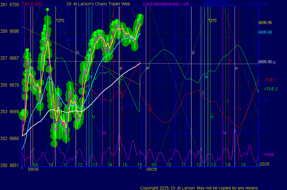![]() ![]() Today: as per chart 3 on SPKISS page 10:51 440, 220, 110 down; sell 6660; stopped for -5 12:32 440, 220, 110 down; sell 6663; stopped 6640 for +23 14:50 440 down, 110 up; passed Tomorrow: Moon oppose Uranus **************************************************************************** during these volatile times, the point values in these instructions should multiplied by 5 ***************************************************************************** For trade times before 11:00, be sure to use EXMA's that include data from 8:15 Eastern Normal Rules ( as published on daytrading forecasts.com in the tutorial): These fit a Trend or Trend continuation scenario, identified by prices trading within a couple of points of the 110 minute EXMA, taking profits on a 12 point range. 1. Watch for the opportunity to go with the trend or change in trend at the time(s) given. Be alert for the turn coming early or late. Be patient and use the tracking indicators. Plan to trade in the direction of the 110 EXMA coming out of that time frame. Prices should stay on one side of the 110 EXMA and it should be moving, or curl up or down from a flat position. Prices should be within about 2 points of the 110 EXMA. The 20 minute EXMA should have crossed the 110 EXMA, or moved toward it and then pulled away from it. When this setup is clear, enter in the direction of the 110 EXMA with a 3 point stop. *** in volatile markets this may need to be 6 points If each setup is not clear 60 minutes after the given time, skip the trade. 2. Move the stop 1 point each 30 minutes. If the market moves decently, trail it by 3 points ( 6 points in volatile markets). 3. Cover on a 5 point gain**, 90 minutes after entry , at the next Tide turn , or if the prices clearly recross the 110 minute EXMA. ********************************************************************** **FAST MOVE RULE If the trade gains 3 points within 30 minutes of entry, press the stop, using the 20 EXMA as a guide to move the stop to the low or high of each pullback (normally about 15 minutes long) once the move makes a new high or low. Cover any gain of 9* points. *It is OK to use the fast stop rule if a trade starts fast, but to then cover at +5 or +4 if it slows or stalls *** Stall rule: Cover any trade that stalls for more than 45 minutes *** Carry through rule If you are in a trade that is working well, if is OK to carry through the next Tide turn *** GO BIG rule: if morning is a big move (>12 points ), and midday is a congestion or pullback, and the last trade of the day sets up near 2:00, a move greater than 9 points may be captured using the technique illustrated at http://moneytide.com/hans/cc09092008.asp *** VOLATILE MARKET RULE -use with discretion in volatile markets, the 55 minute EXMA used in place of the 110 minute EXMA may provide an earlier and lower risk entry. This is most useful when the market is extremely oversold or overbought and reversing, or during a fast move with minimal dips and one is looking to join the move. |