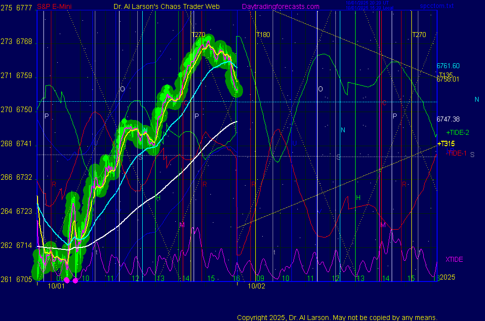 ![]() ![]() Today: per chart 3 on the SPKISS page 10:20 passed-440, 220 flat-trading both sides 11:57 passed-440, 220 flat-trading both sides Tomorrow: Moon conjoin Pluto, square Mercury, square Chiron, oppose Jupiter in a Grand Cross **************************************************************************** during these volatile times, the point values in these instructions should multiplied by 5 ***************************************************************************** For trade times before 11:00, be sure to use EXMA's that include data from 8:15 Eastern Normal Rules ( as published on daytrading forecasts.com in the tutorial): These fit a Trend or Trend continuation scenario, identified by prices trading within a couple of points of the 110 minute EXMA, taking profits on a 12 point range. 1. Watch for the opportunity to go with the trend or change in trend at the time(s) given. Be alert for the turn coming early or late. Be patient and use the tracking indicators. Plan to trade in the direction of the 110 EXMA coming out of that time frame. Prices should stay on one side of the 110 EXMA and it should be moving, or curl up or down from a flat position. Prices should be within about 2 points of the 110 EXMA. The 20 minute EXMA should have crossed the 110 EXMA, or moved toward it and then pulled away from it. When this setup is clear, enter in the direction of the 110 EXMA with a 3 point stop. *** in volatile markets this may need to be 6 points If each setup is not clear 60 minutes after the given time, skip the trade. 2. Move the stop 1 point each 30 minutes. If the market moves decently, trail it by 3 points ( 6 points in volatile markets). 3. Cover on a 5 point gain**, 90 minutes after entry , at the next Tide turn , or if the prices clearly recross the 110 minute EXMA. ********************************************************************** **FAST MOVE RULE If the trade gains 3 points within 30 minutes of entry, press the stop, using the 20 EXMA as a guide to move the stop to the low or high of each pullback (normally about 15 minutes long) once the move makes a new high or low. Cover any gain of 9* points. *It is OK to use the fast stop rule if a trade starts fast, but to then cover at +5 or +4 if it slows or stalls *** Stall rule: Cover any trade that stalls for more than 45 minutes *** Carry through rule If you are in a trade that is working well, if is OK to carry through the next Tide turn *** GO BIG rule: if morning is a big move (>12 points ), and midday is a congestion or pullback, and the last trade of the day sets up near 2:00, a move greater than 9 points may be captured using the technique illustrated at http://moneytide.com/hans/cc09092008.asp *** VOLATILE MARKET RULE -use with discretion in volatile markets, the 55 minute EXMA used in place of the 110 minute EXMA may provide an earlier and lower risk entry. This is most useful when the market is extremely oversold or overbought and reversing, or during a fast move with minimal dips and one is looking to join the move. |